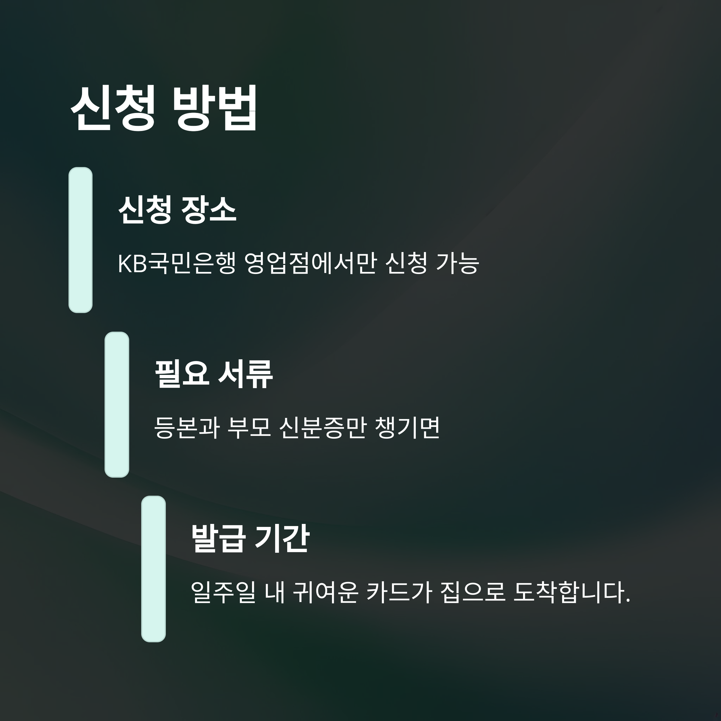 저도 처음에 KB스타뱅킹 앱으로 알아봤다가, 결국 아이와 함께 직접 은행 영업점을 방문해 신청했습니다. 카드 수령까지는 일주일도 안 걸렸고, 아이가 받을 때 정말 기뻐했어요.