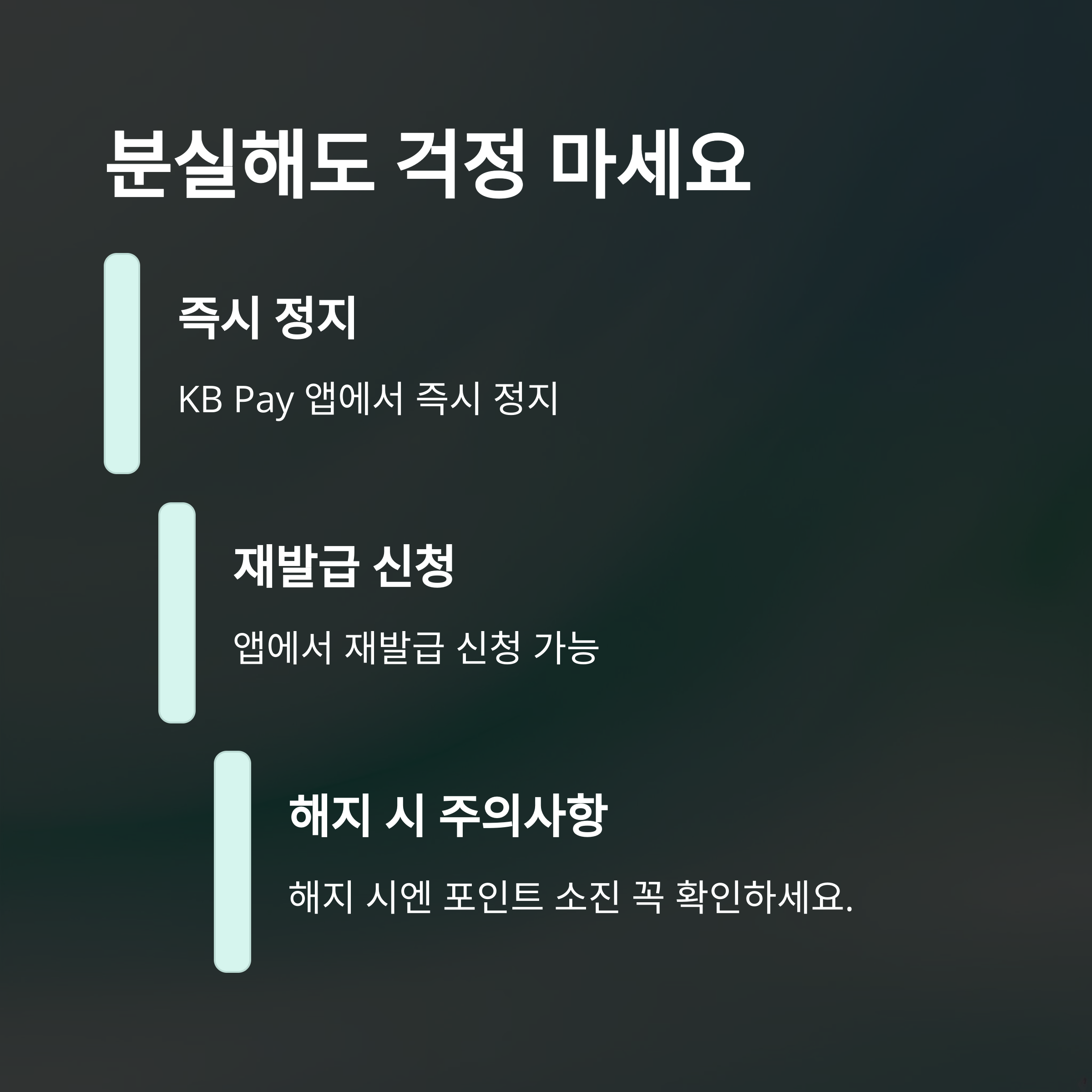 | 분실 신고 | KB Pay 앱 → 카드 → 분실신고 | 즉시 사용 정지 |