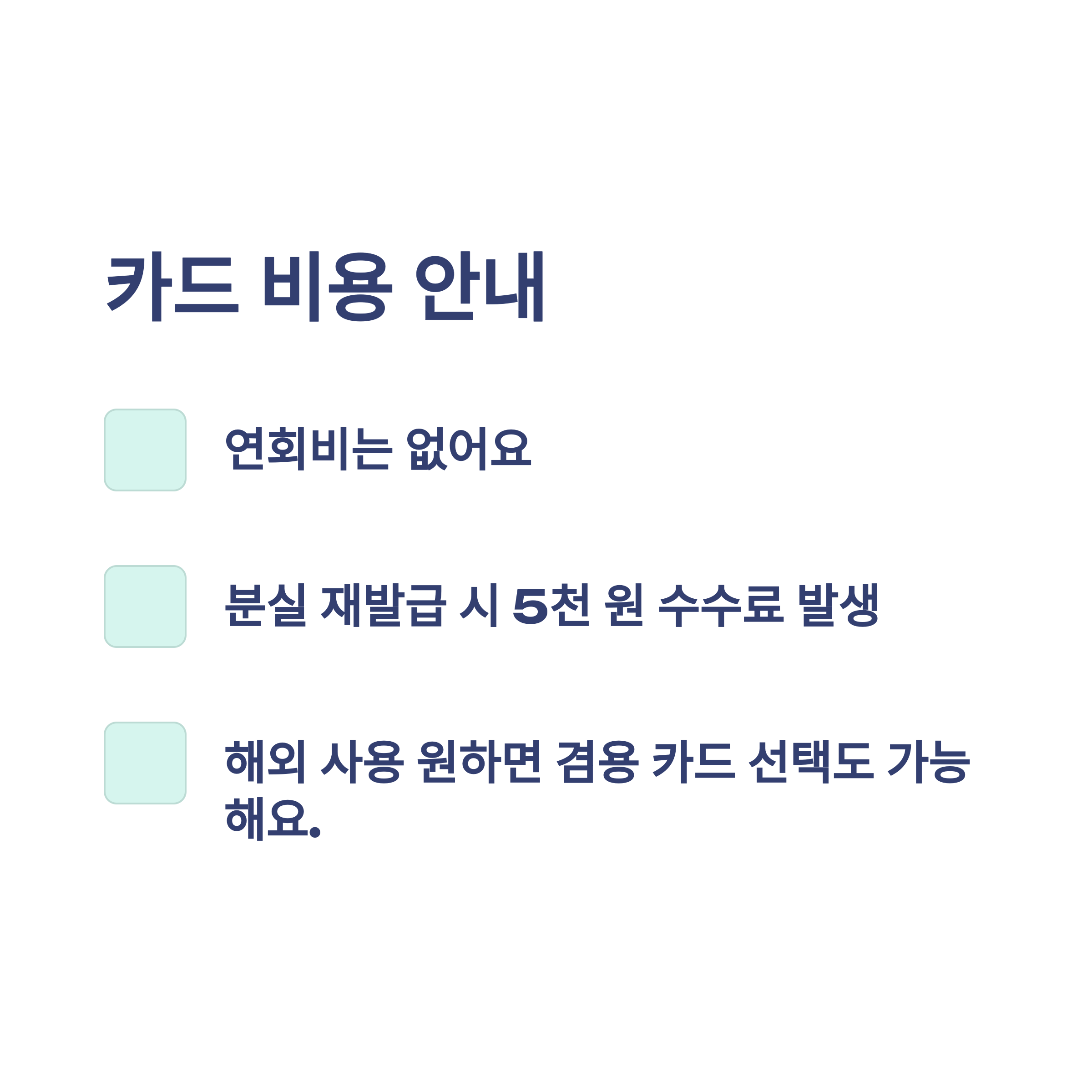 | 기타 수수료 | 해외 이용 시 해외 수수료 발생 가능 | 해외겸용 카드 선택 시 |