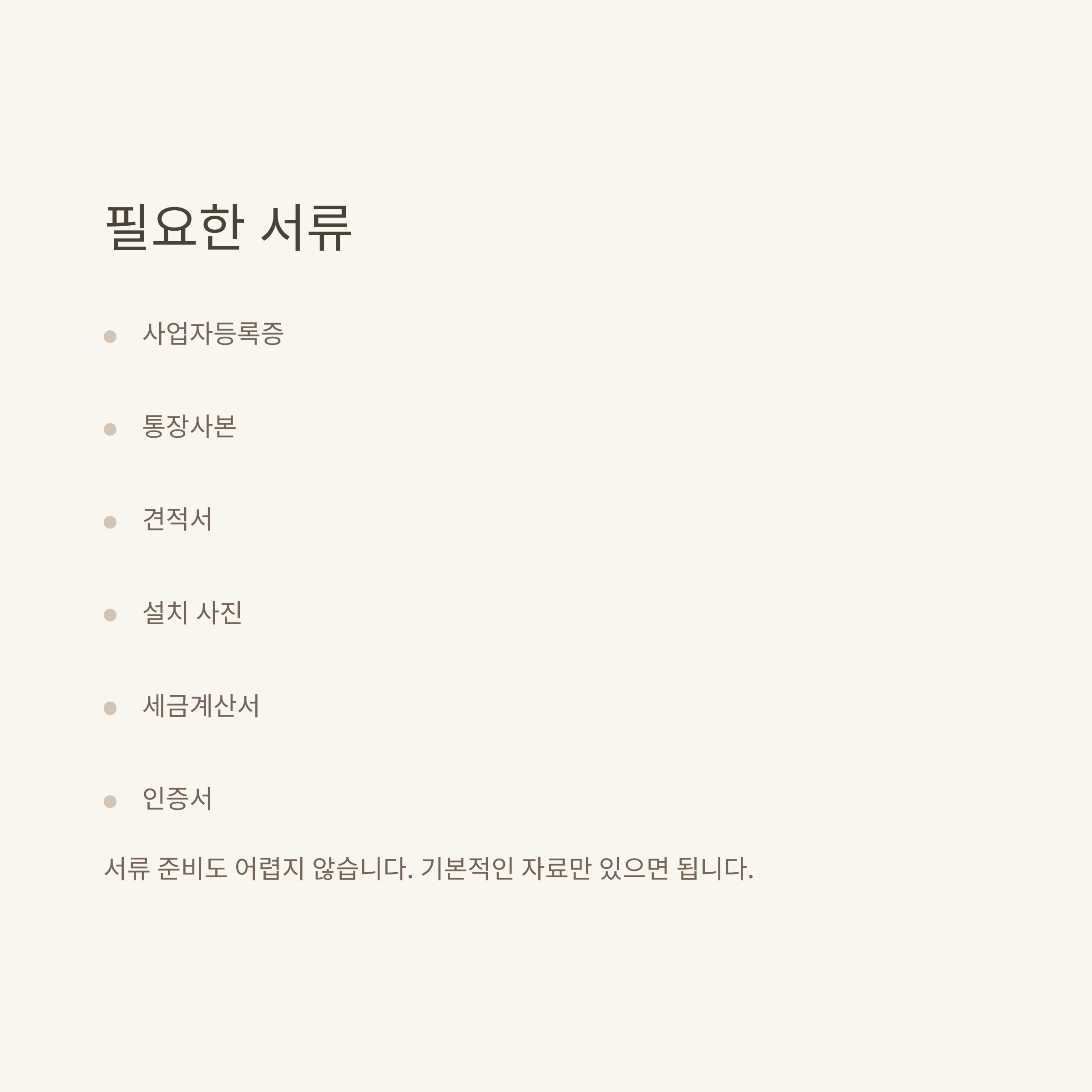 제가 신청했을 때 준비한 서류들을 기준으로 설명드리면, 대부분은 사업자라면 이미 가지고 있는 서류들이라 큰 부담은 없었습니다. 다만 설치 후 제출하는 서류까지 꼼꼼히 챙기는 게 중요합니다.