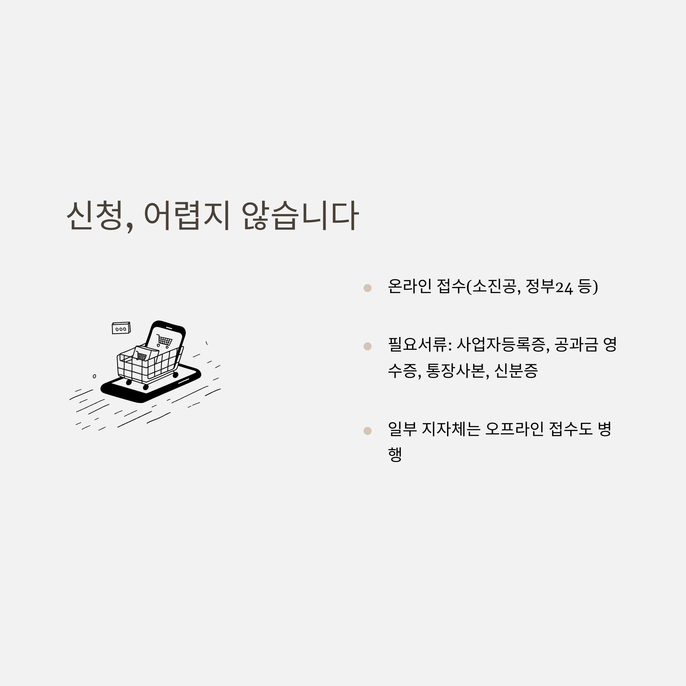 가장 중요한 준비물은 사업자등록증, 공과금 납부 영수증(3~6개월분), 신분증, 통장사본 등입니다. 일부 지역은 추가 서류(임대차계약서, 매출증빙 등)를 요구할 수 있으니, 꼭 공고문을 꼼꼼히 읽어보셔야 합니다.