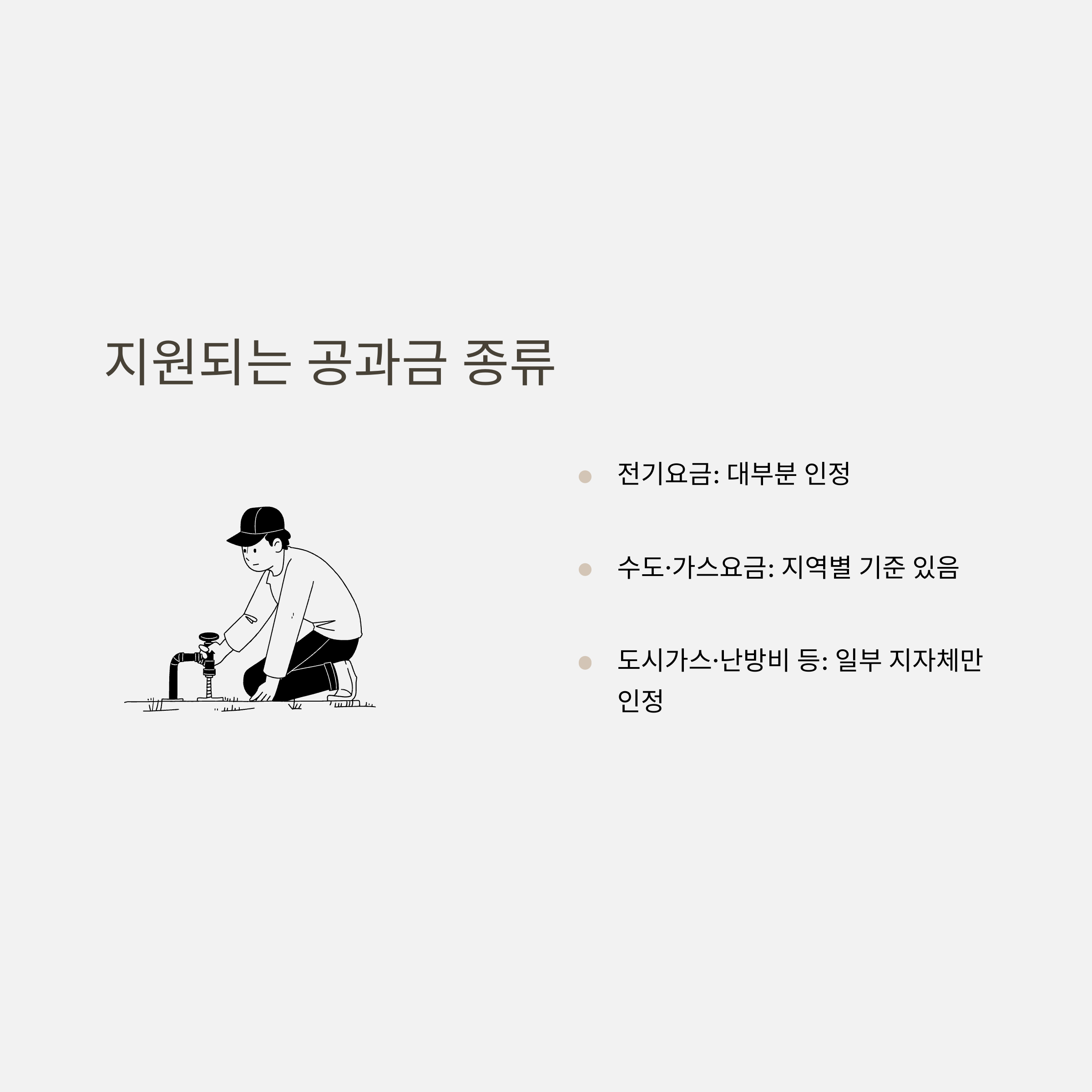 | 지원 항목 | 전기, 수도, 가스 등 각종 공과금 |