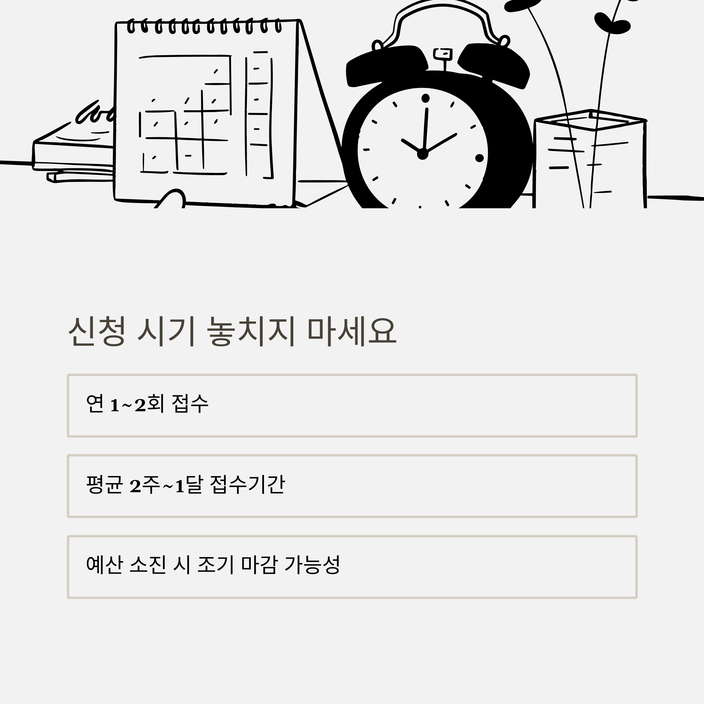 | 신청기간 | 연 1~2회, 2주~1달(예산 소진 시 마감) |