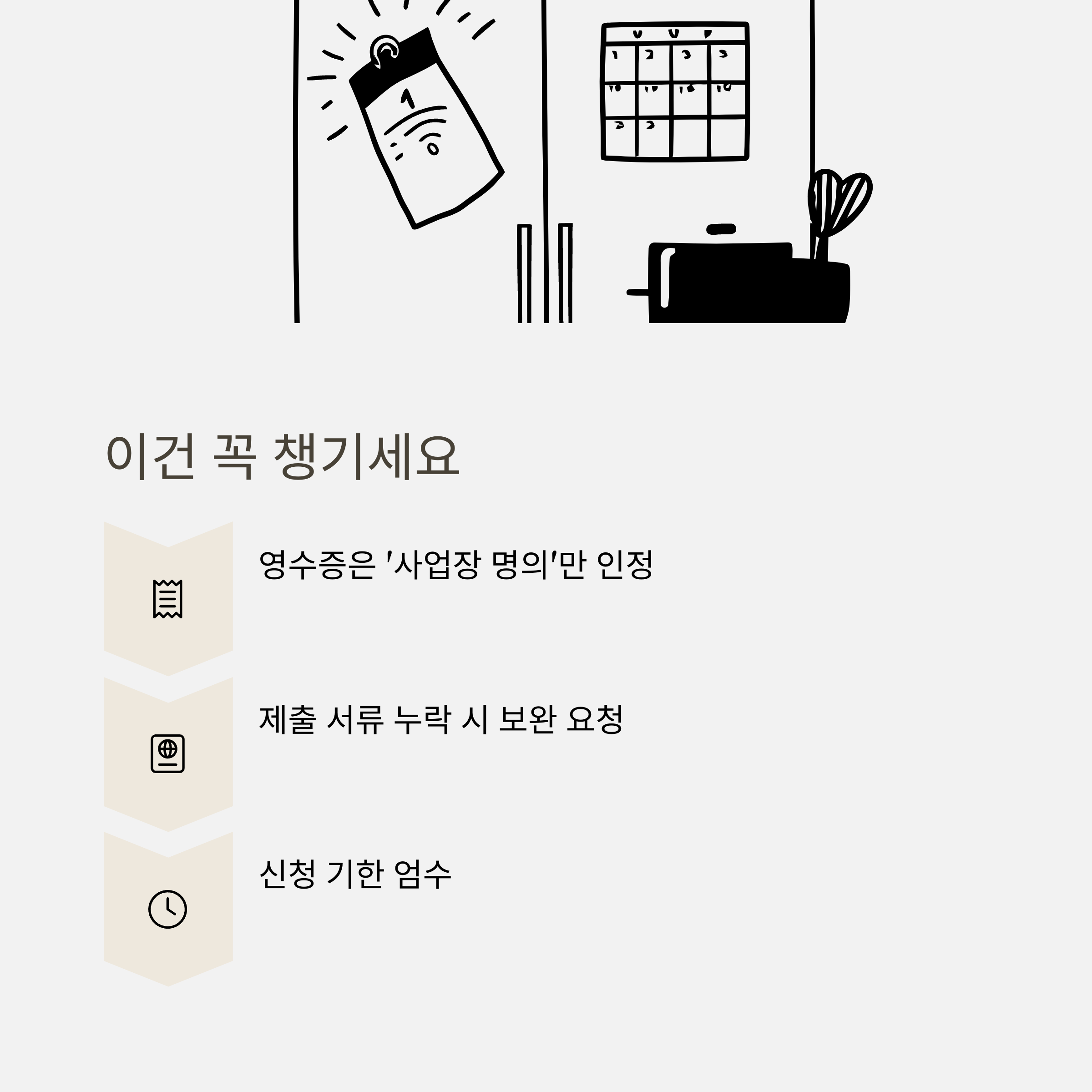 가장 많이 실수하는 부분은 공과금 납부 영수증 누락, 사업자등록증 기재 정보 오류, 그리고 신청 기간 내 미접수 등입니다. 저도 처음에는 서류 하나 빠뜨렸다가 보완요청을 받았던 적이 있었어요.