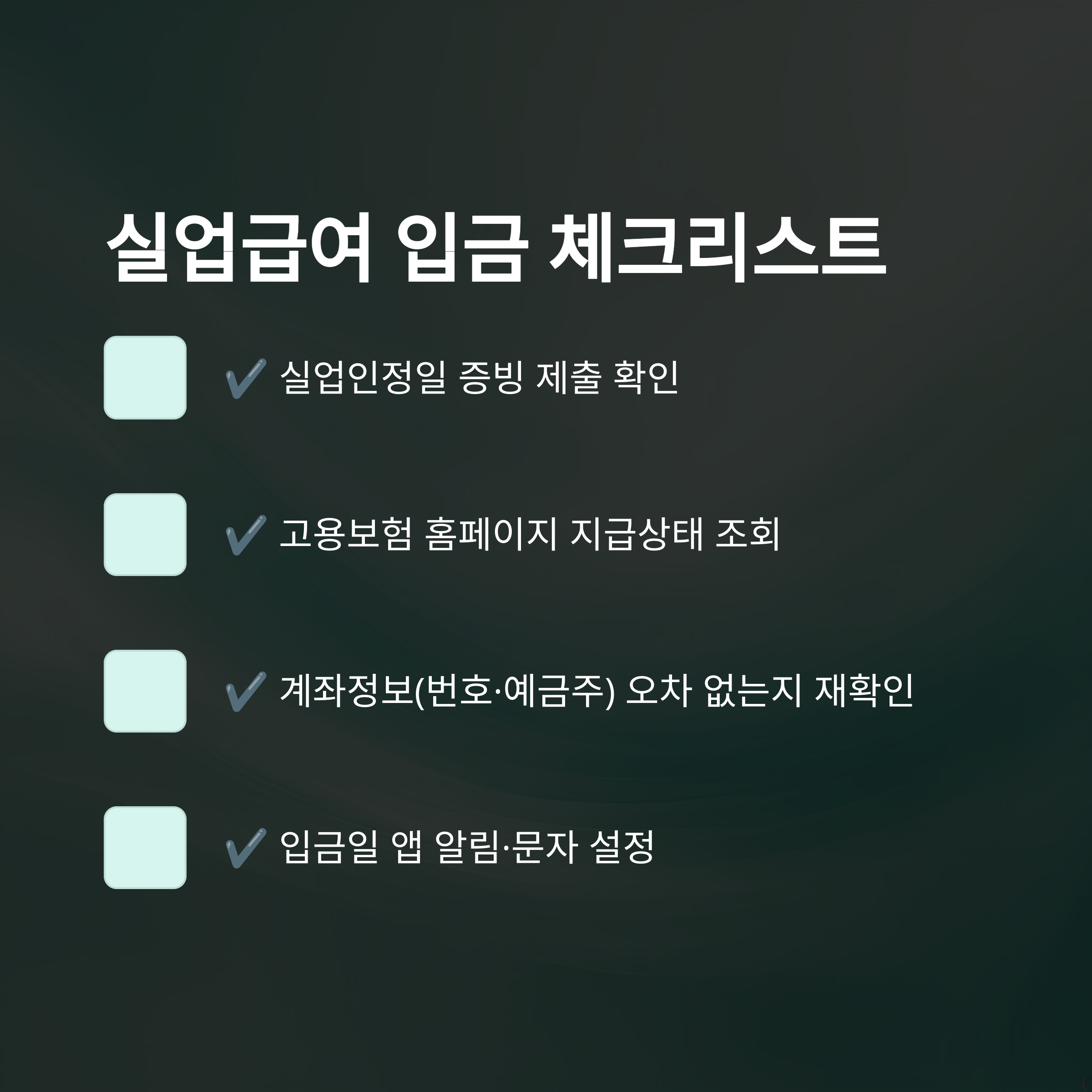 입금 전에는 실업인정일 절차와 계좌정보 입력, 증빙서류 제출 등을 꼼꼼히 확인해야 합니다. 입금 후에는 반드시 통장 내역·지급금액·입금자명을 확인해서 누락이나 오류가 없는지 점검해야 하죠. 저는 지급 후 실업인정일, 구직활동 기록까지 따로 메모해뒀습니다.