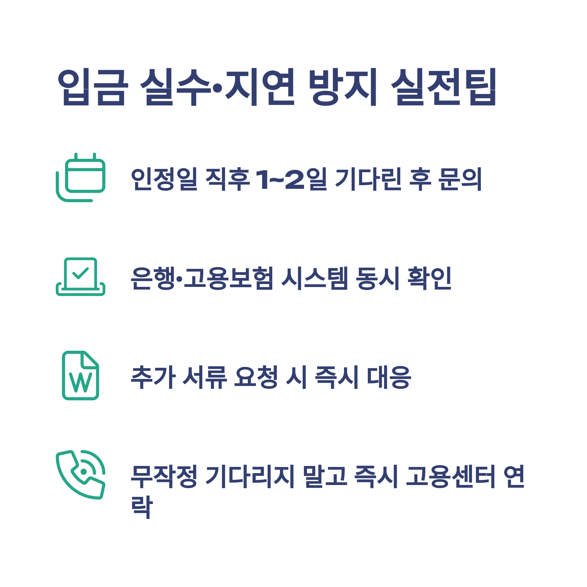 | 입금 지연시 대처 | 고용보험·은행 동시 확인, 1350 문의 |