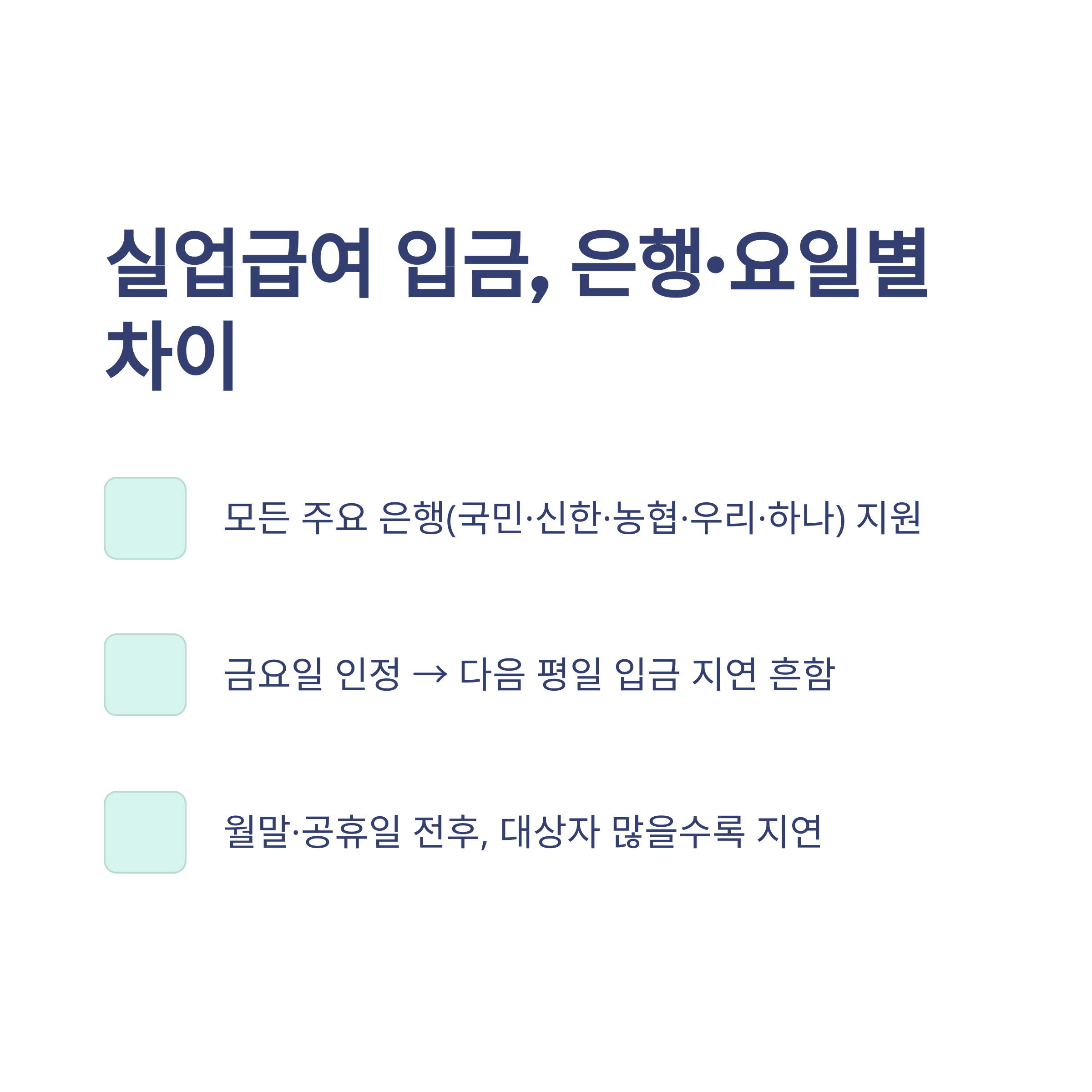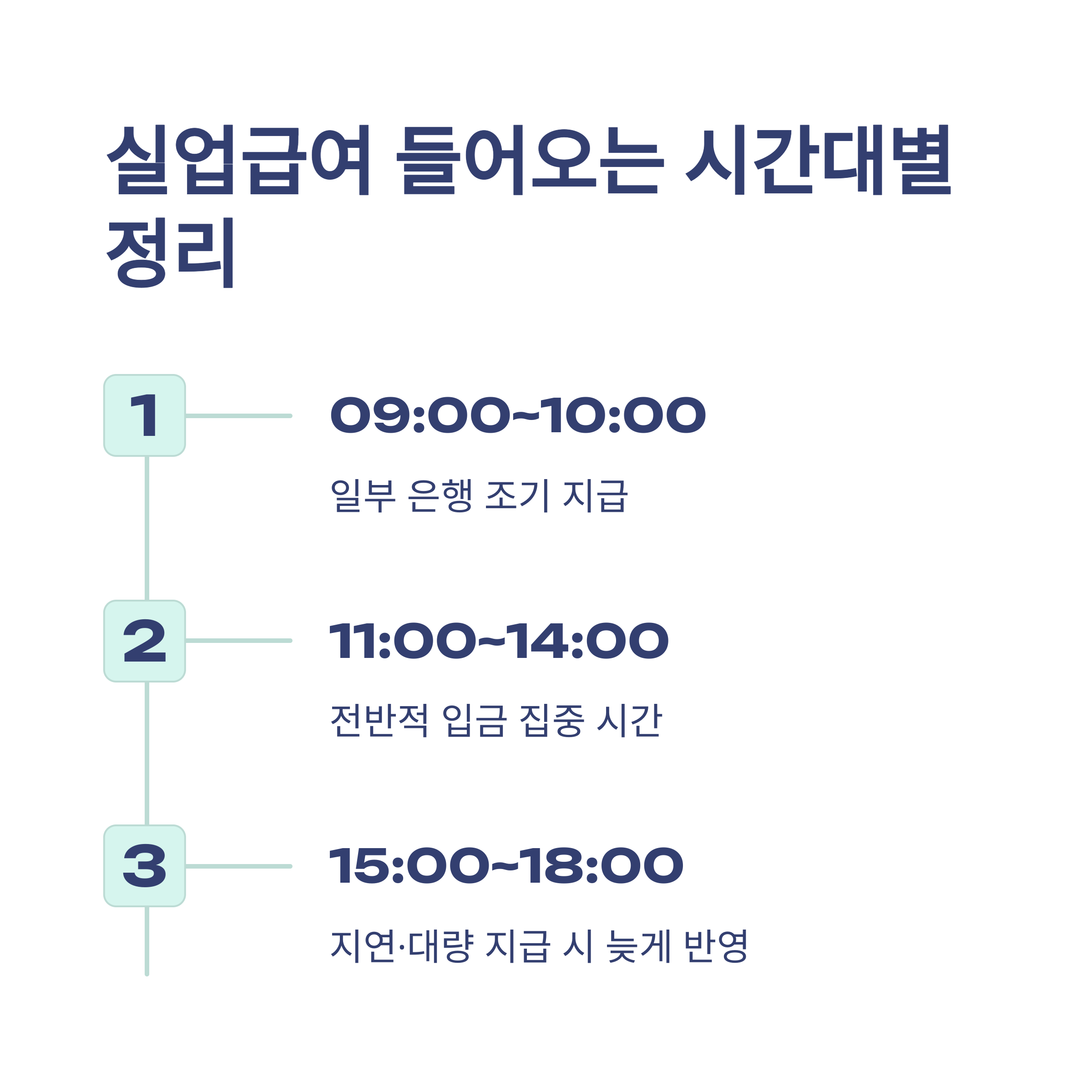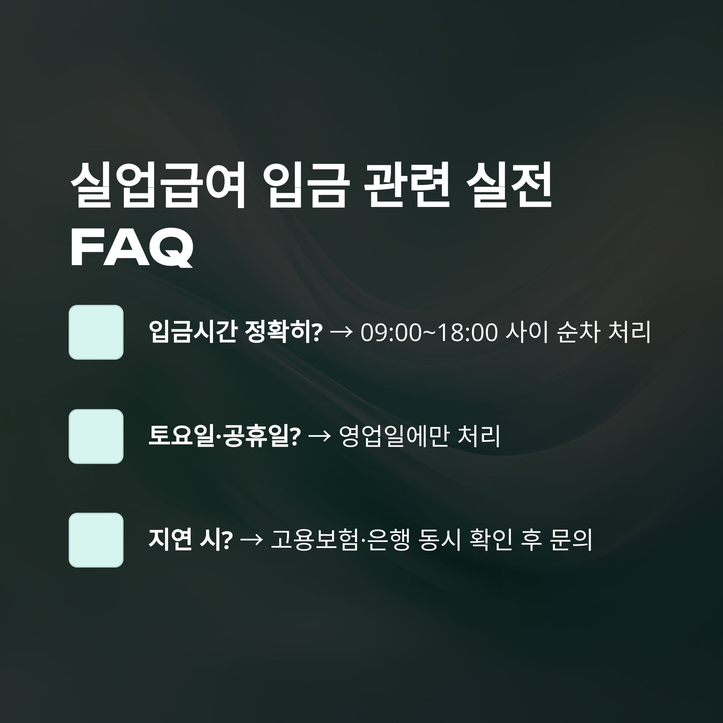 실업급여 입금은 은행 영업시간 내 처리되니, 토요일·공휴일엔 별도 입금이 이루어지지 않는다는 점도 참고하세요.
