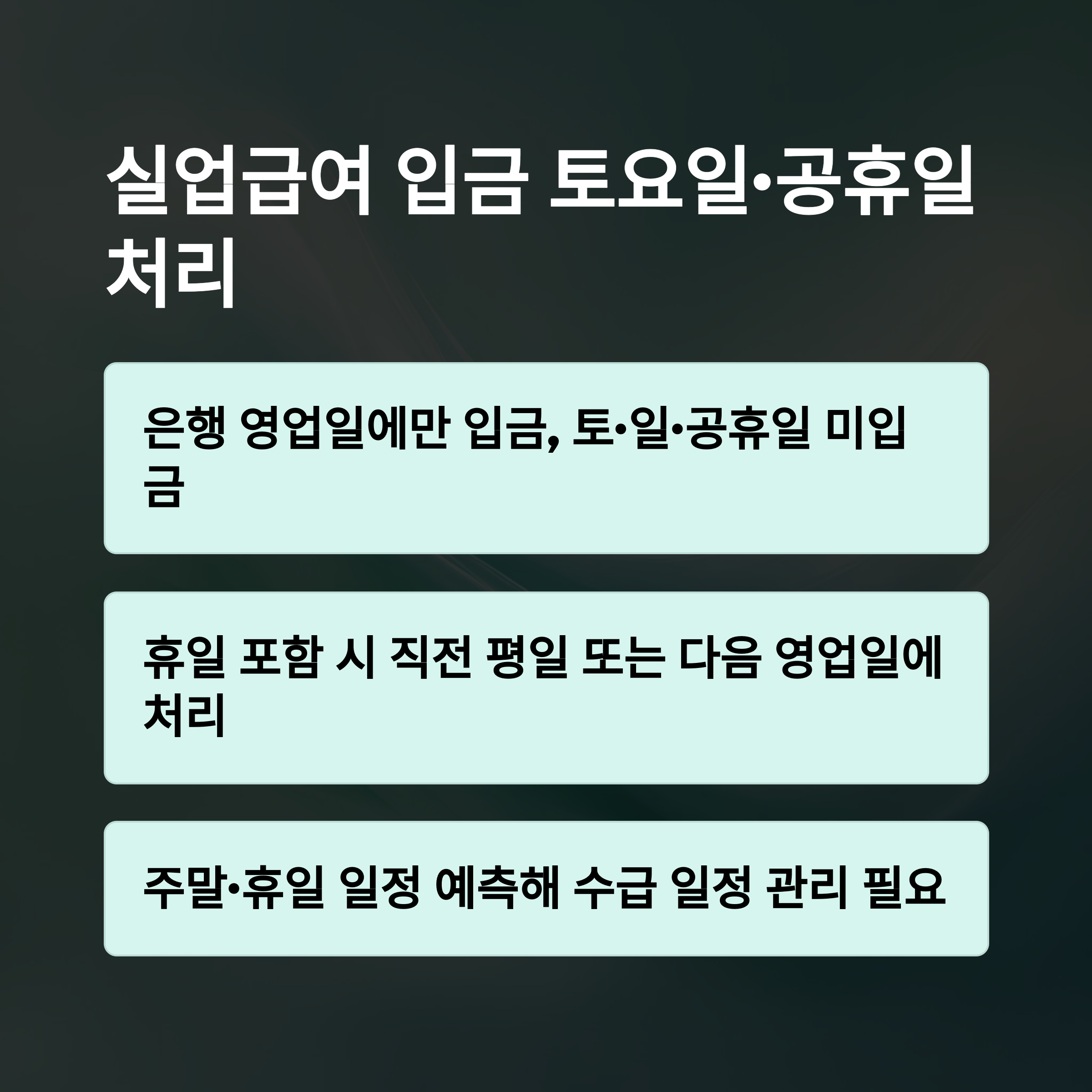 토요일이나 공휴일, 대체휴일에는 입금이 진행되지 않고, 만약 지급일이 휴일에 걸리면 ‘직전 평일’ 또는 ‘다음 영업일’에 처리되는 구조입니다. 실업인정일 직후 지급이 늦어질 수 있으니, 주말·공휴일 일정은 미리 확인하시는 게 안전합니다.