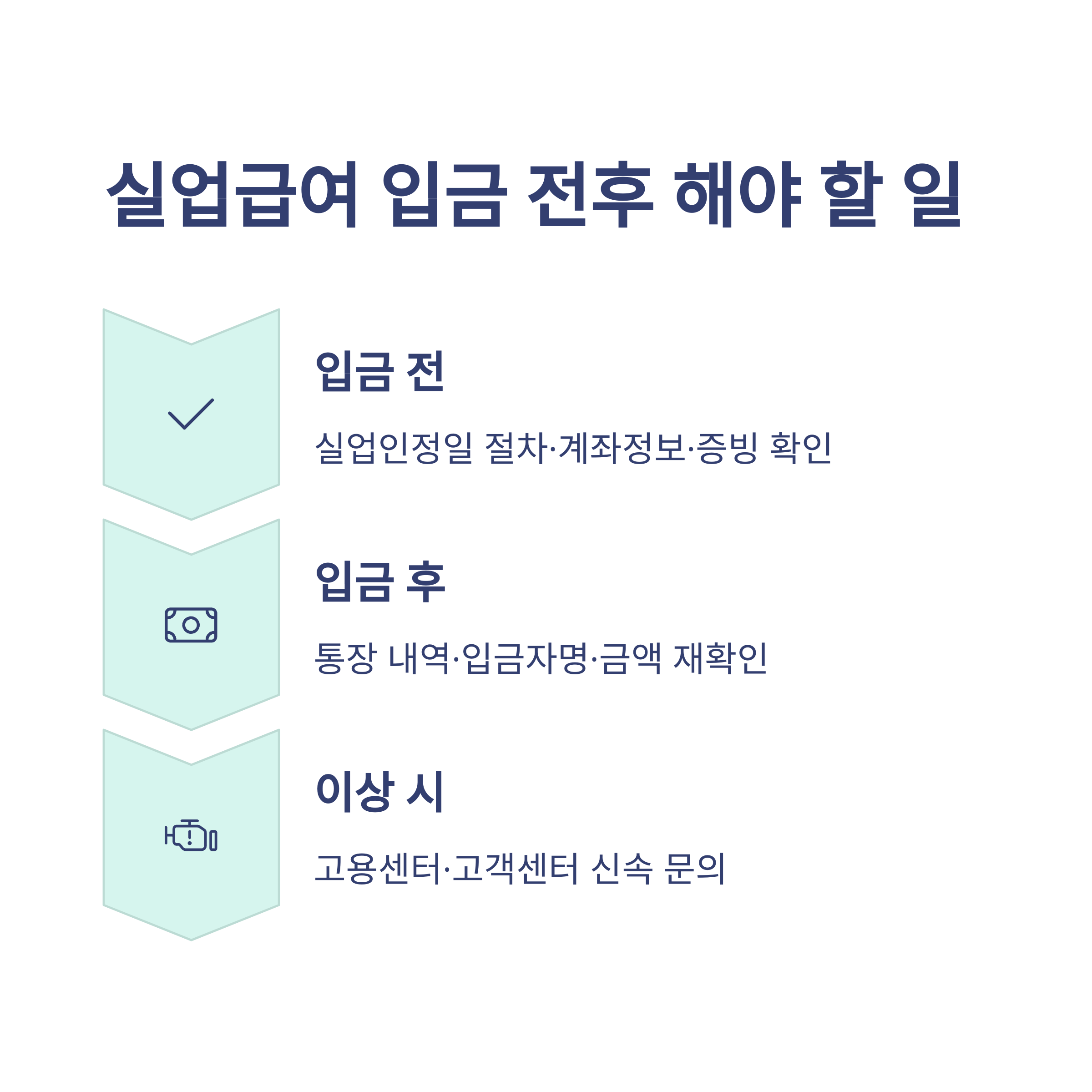 - 입금 전: 실업인정일, 계좌정보, 증빙자료 확인