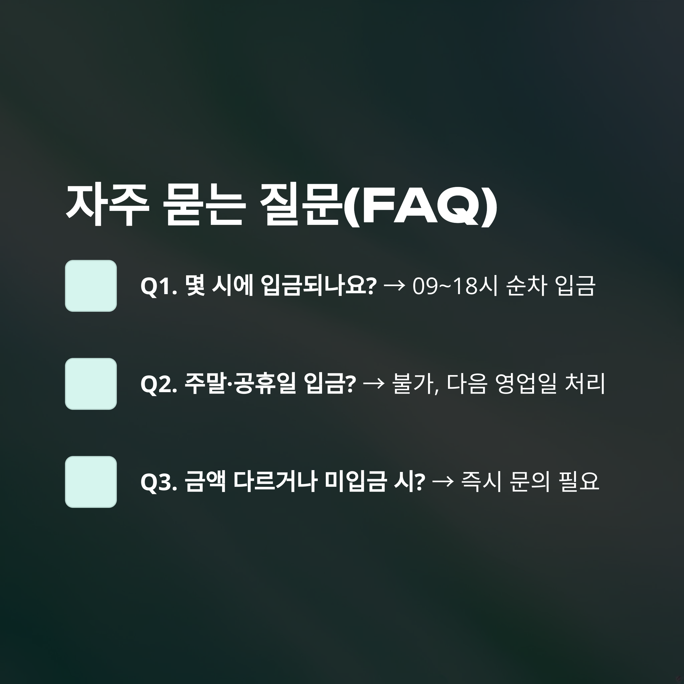 A. 오전 9시~오후 6시 사이 순차 입금, 평균 11~14시가 많습니다. - Q. 토요일이나 공휴일에도 입금이 되나요?