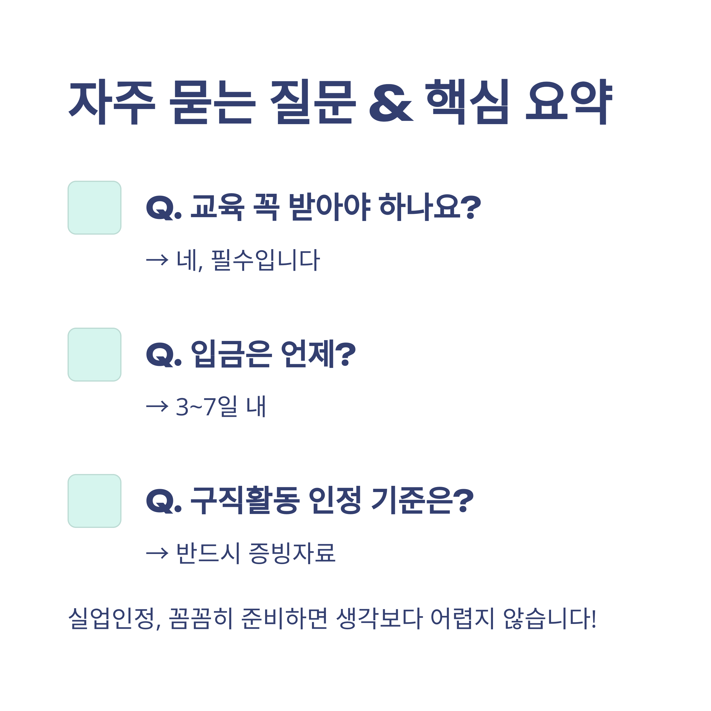- 저도 처음엔 순서가 복잡해 보였지만, 고용센터 안내에 따라 1차 교육 이수→실업인정일 지정→구직활동 증빙 순으로 차근차근 준비하니 한 번에 통과했습니다.