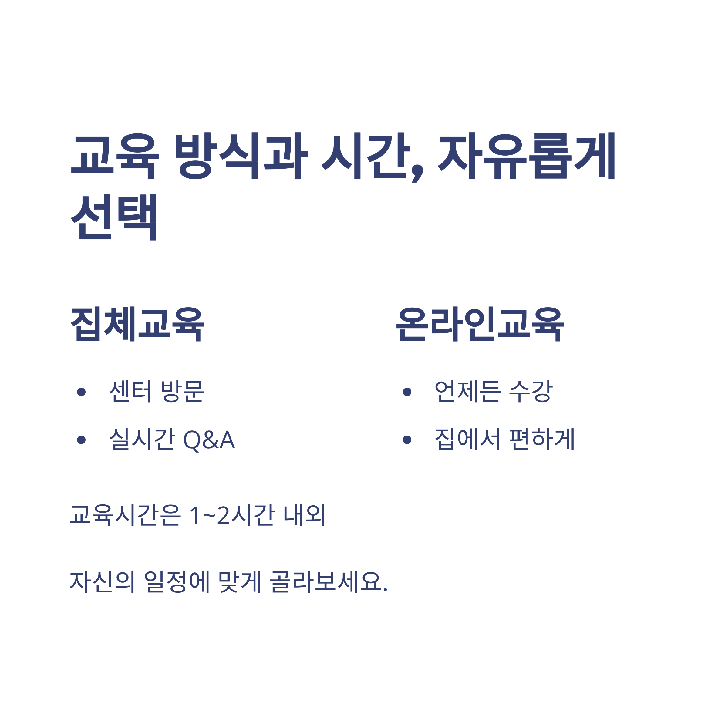 | 집체교육 | 실시간 Q&A, 네트워킹 가능 | 시간·장소 제약, 예약필수 |