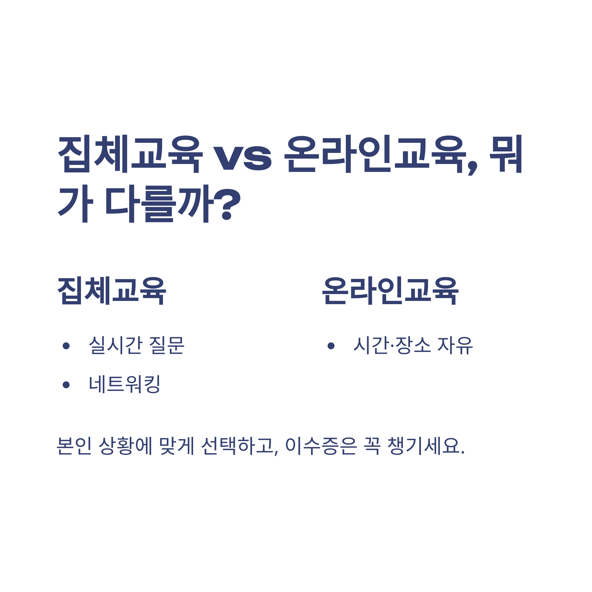 | 온라인교육 | 언제든 수강, 이동·시간절약 | 현장 질문 어려움 |