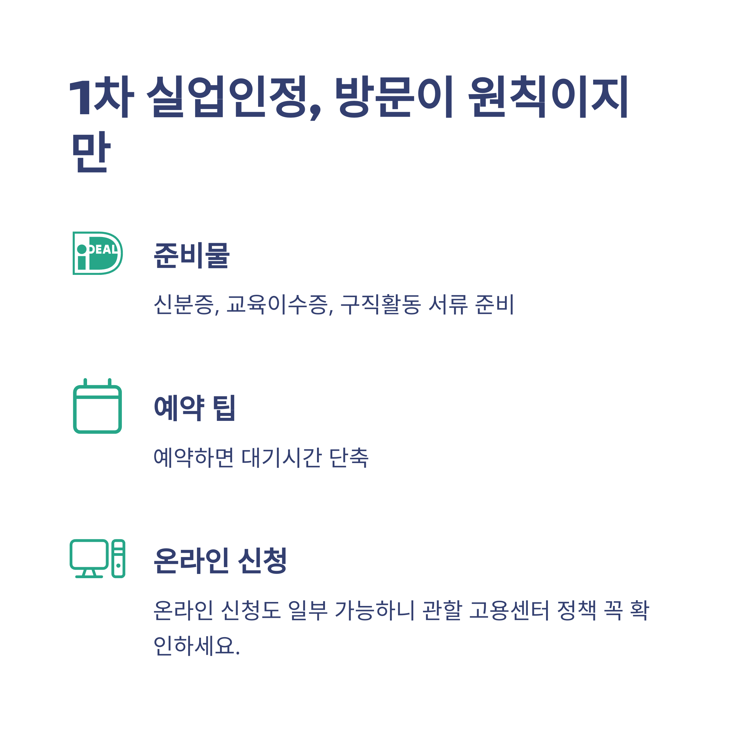 - 직접 방문이 불편하다면 인터넷 신청(모바일·PC)도 가능하지만, 1차 실업인정은 현장 방문이 원칙인 경우가 많으니 사전 확인 필요합니다.