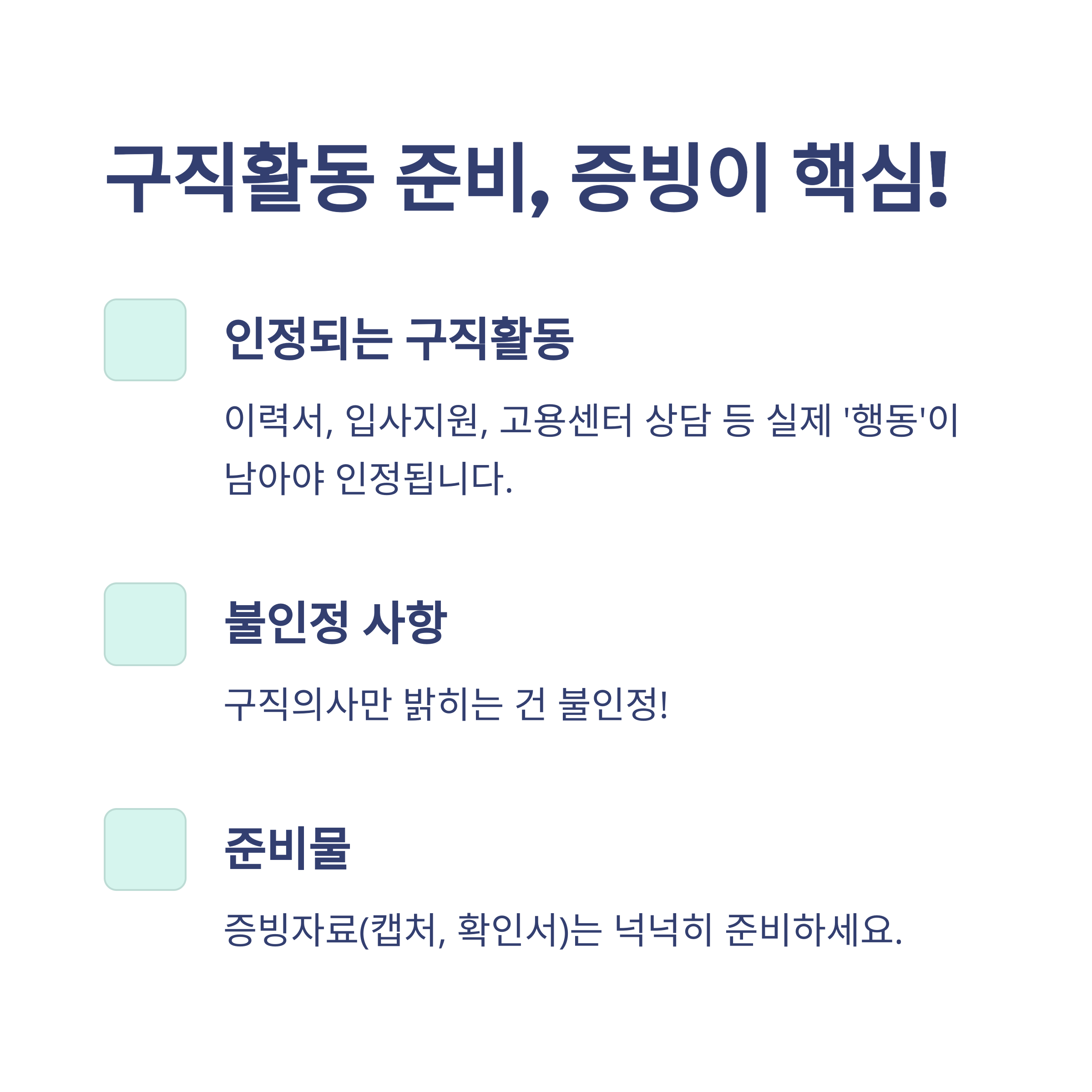 - 구직활동은 이력서, 자기소개서, 입사지원 내역 등 객관적 자료로 남겨야 하며, 단순 구직의사만으로는 인정이 어렵습니다.