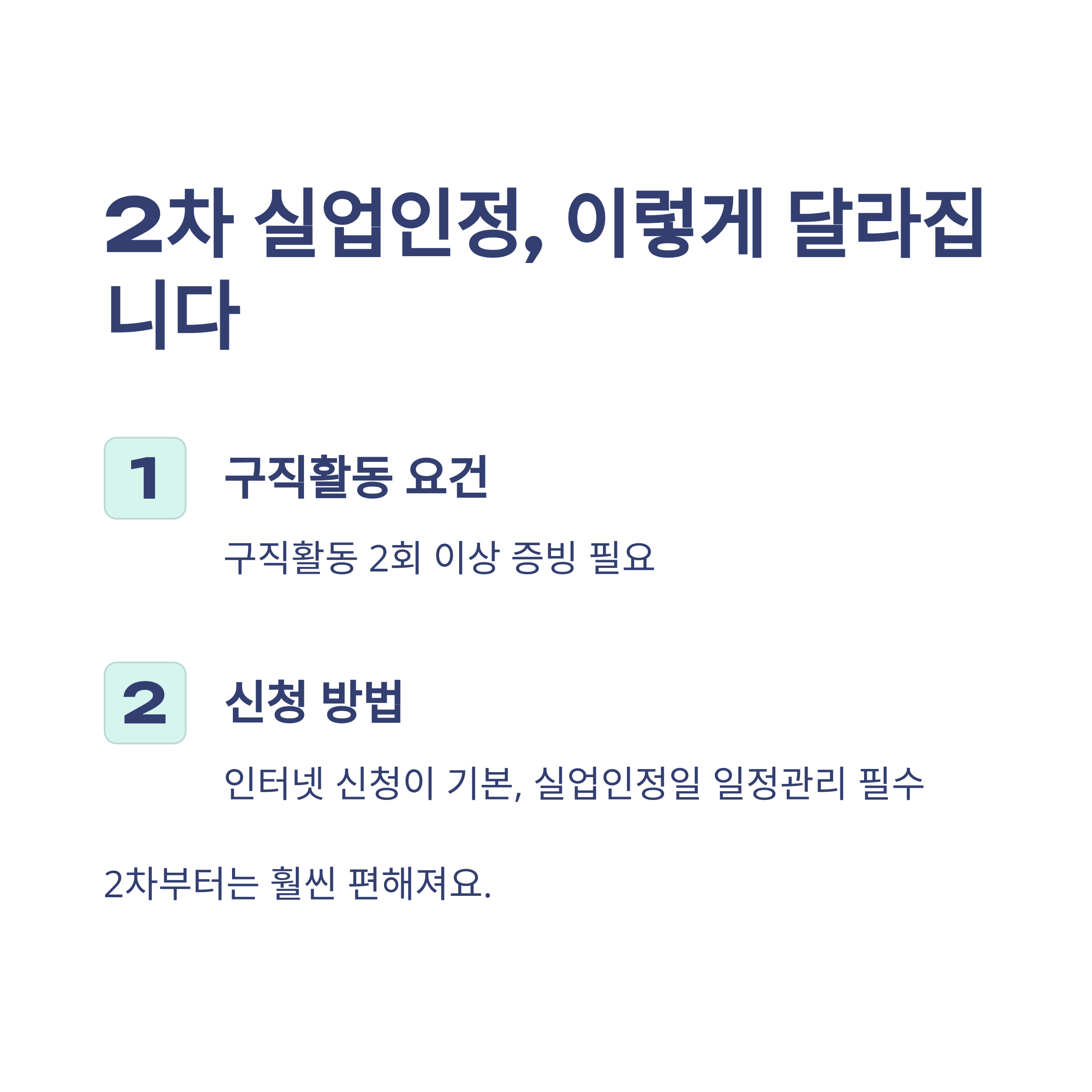 | 2차 실업인정 | 구직활동 횟수·신청방식 상이, 일정관리 중요 |