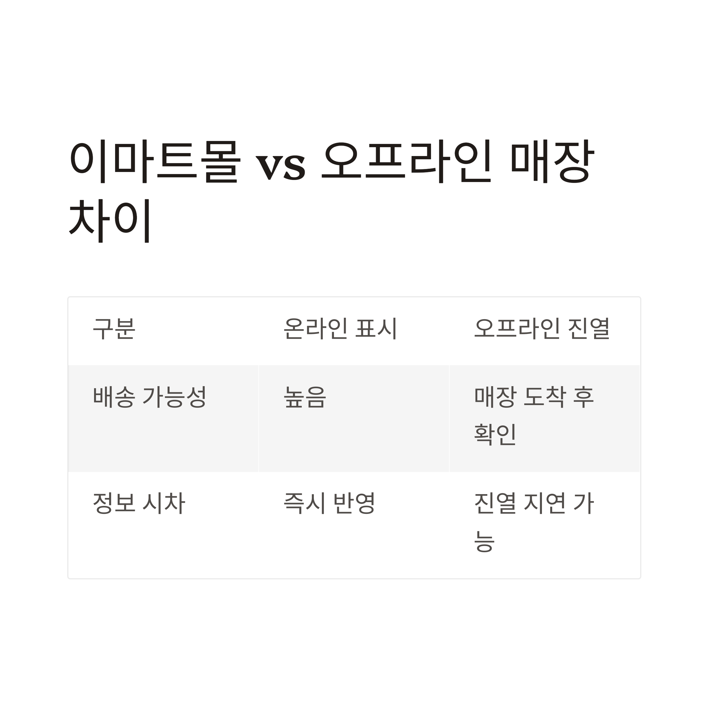 | 정보 시차 | 즉시 반영됨 | 진열 지연 가능성 존재 |