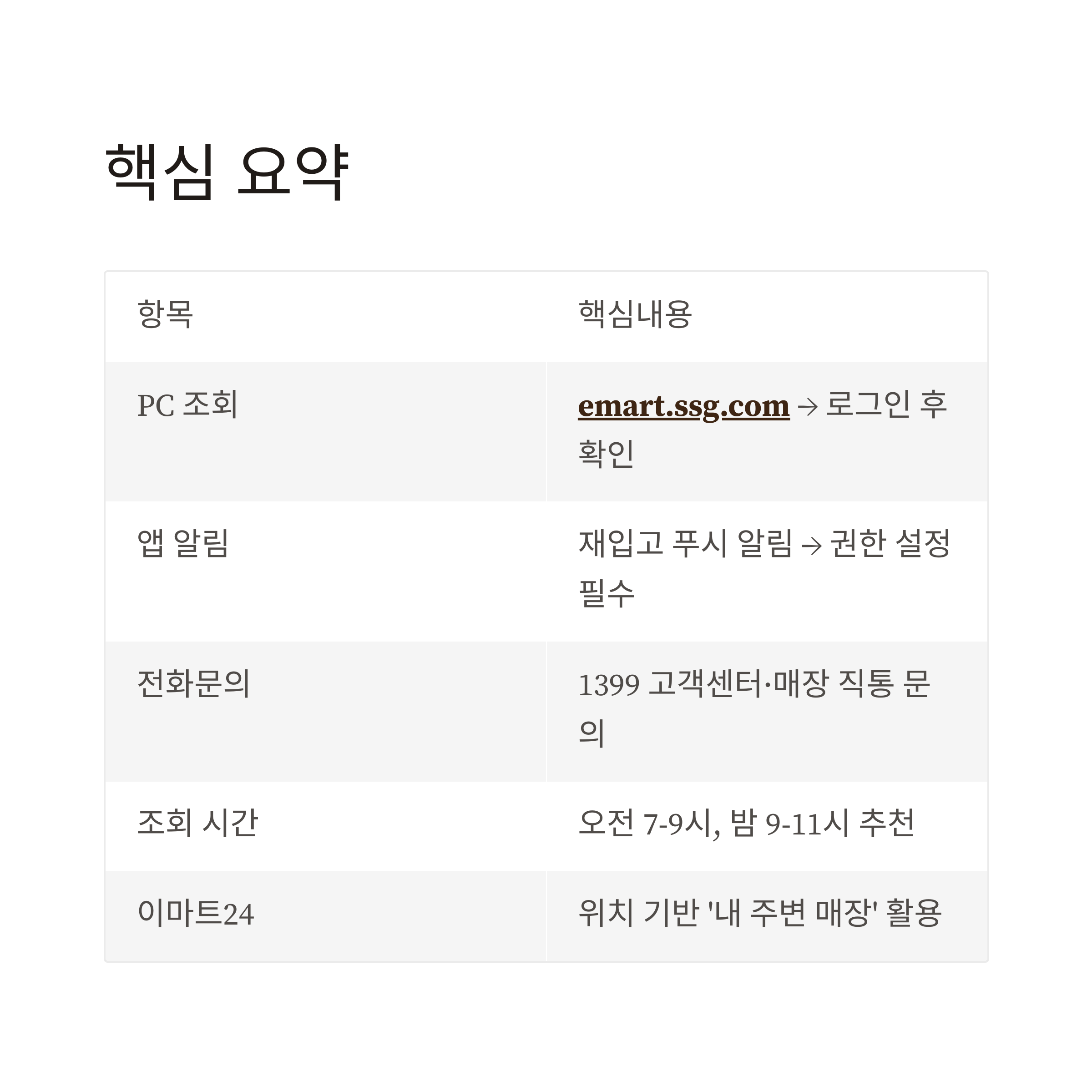 간단한 재고 확인만 한다면 이마트몰에 로그인하지 않고도 가능합니다. 저는 외부에서 급히 확인할 때 로그인 없이 ‘상품 검색 → 상세페이지 → 재고정보’ 순서로만 봐도 충분했어요.