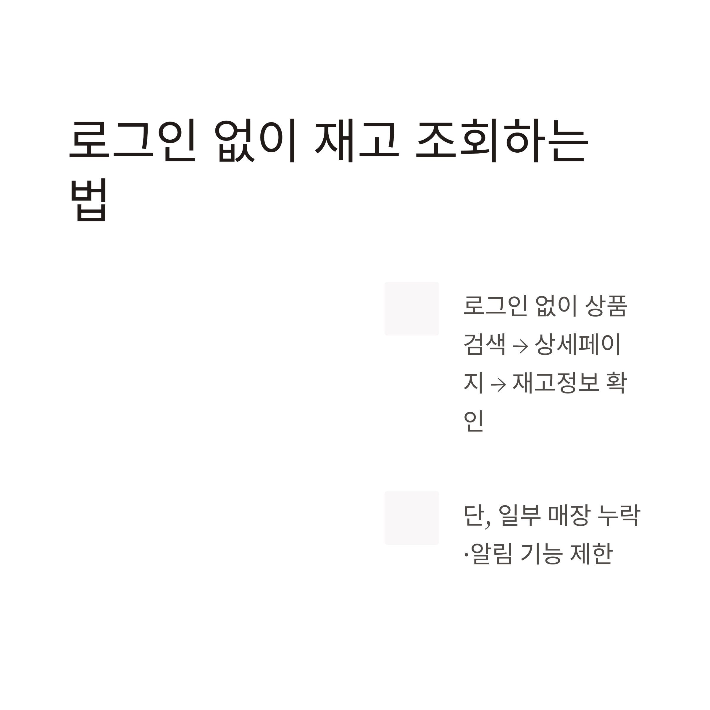 단, 로그인하지 않으면 일부 매장 정보가 누락될 수 있고, 재입고 알림 등 부가 기능은 사용할 수 없습니다. 간단 조회 용도면 로그인 없이 충분하지만, 중요한 제품이면 로그인 후 정확히 확인하는 걸 추천드려요.