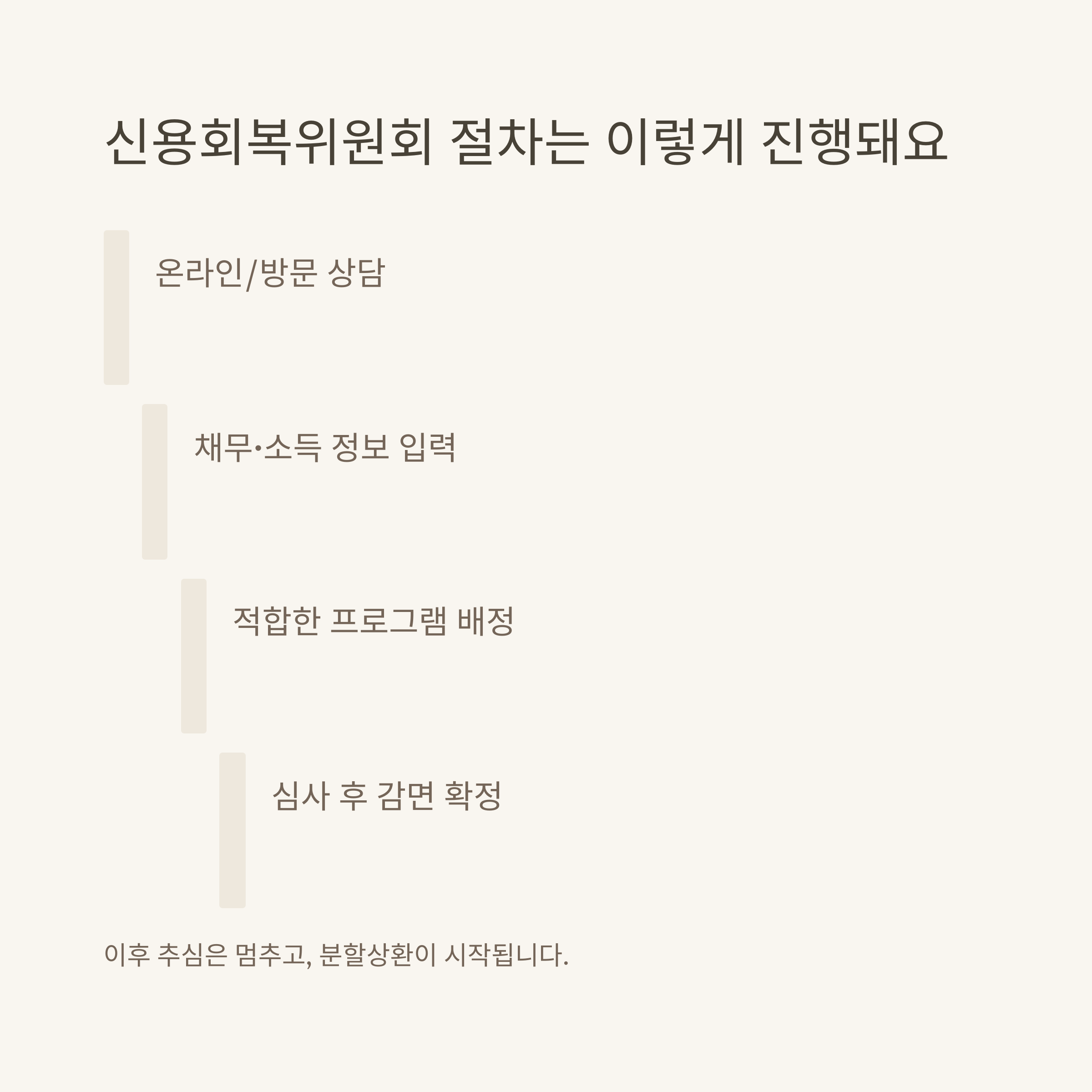 중요한 점은, 심사 통과 후에는 법적으로 추심이 중지되고, 합의서에 따라 분할상환을 시작하게 된다는 점입니다. 실제 진행 현황, 필요 서류, 절차별 소요기간은 신용회복위원회 공식 안내를 참고하면 쉽게 알 수 있습니다.