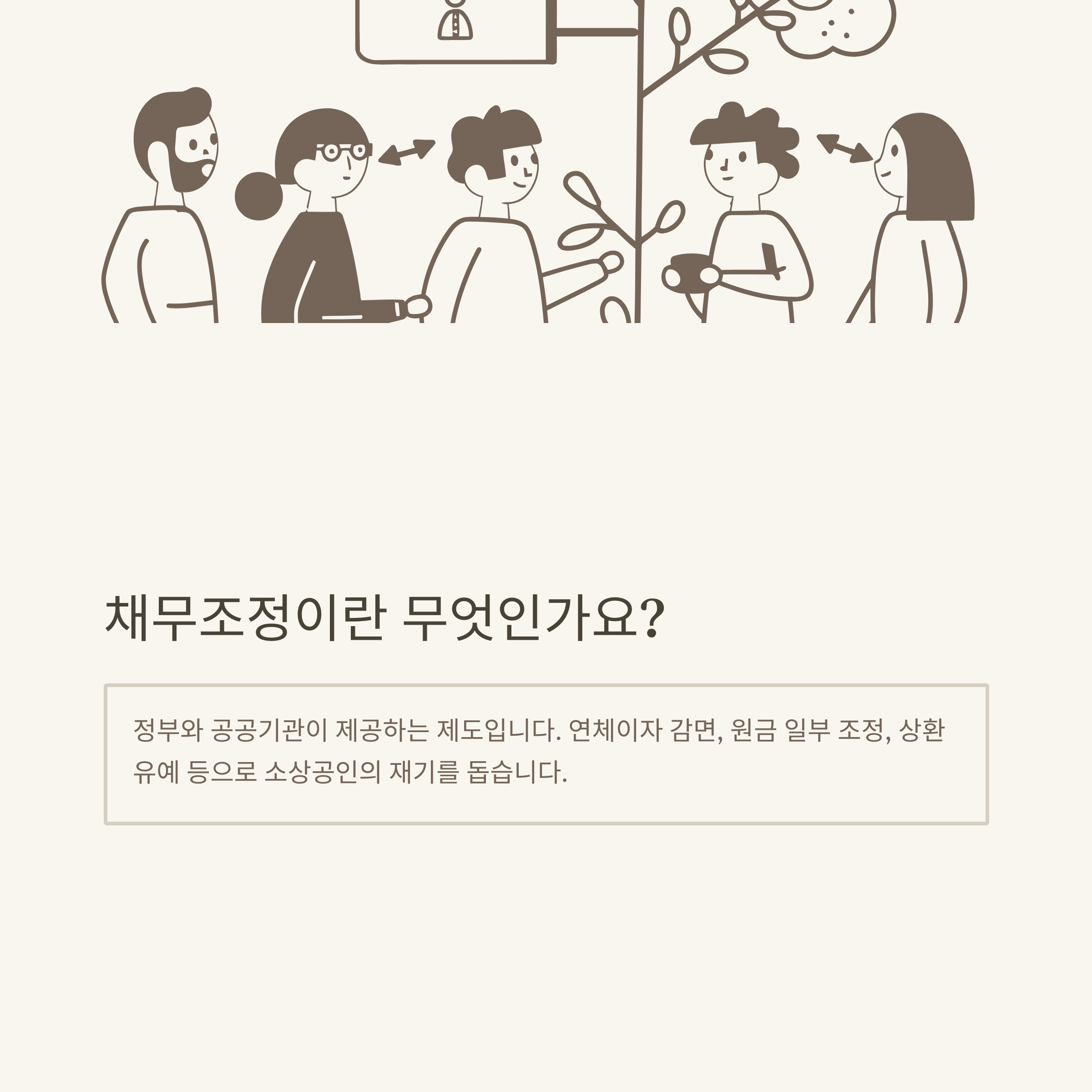 개인채무조정제도란, 일정한 요건(소득, 연체기간 등)을 충족한 개인이나 소상공인이 채무를 감당할 수 있도록 원금 감면, 이자 면제, 상환기간 연장 등 다양한 방법으로 재정적 부담을 줄여주는 프로그램입니다.