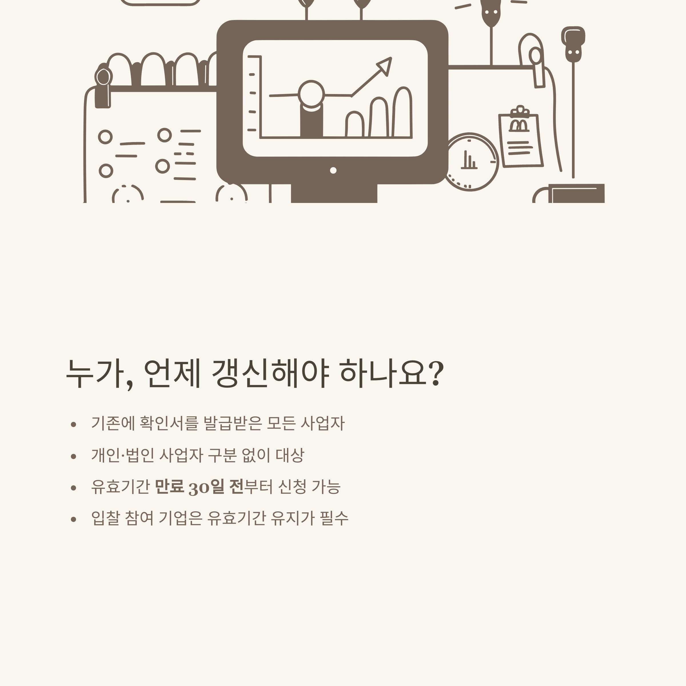 갱신 대상과 신청 시기를 놓치면 실무에 치명적인 문제가 생길 수 있습니다. 실제로 입찰 마감 하루 전, 갱신 안 된 확인서 때문에 낙찰 기회를 놓친 적이 있어 그때 정말 아찔했어요.