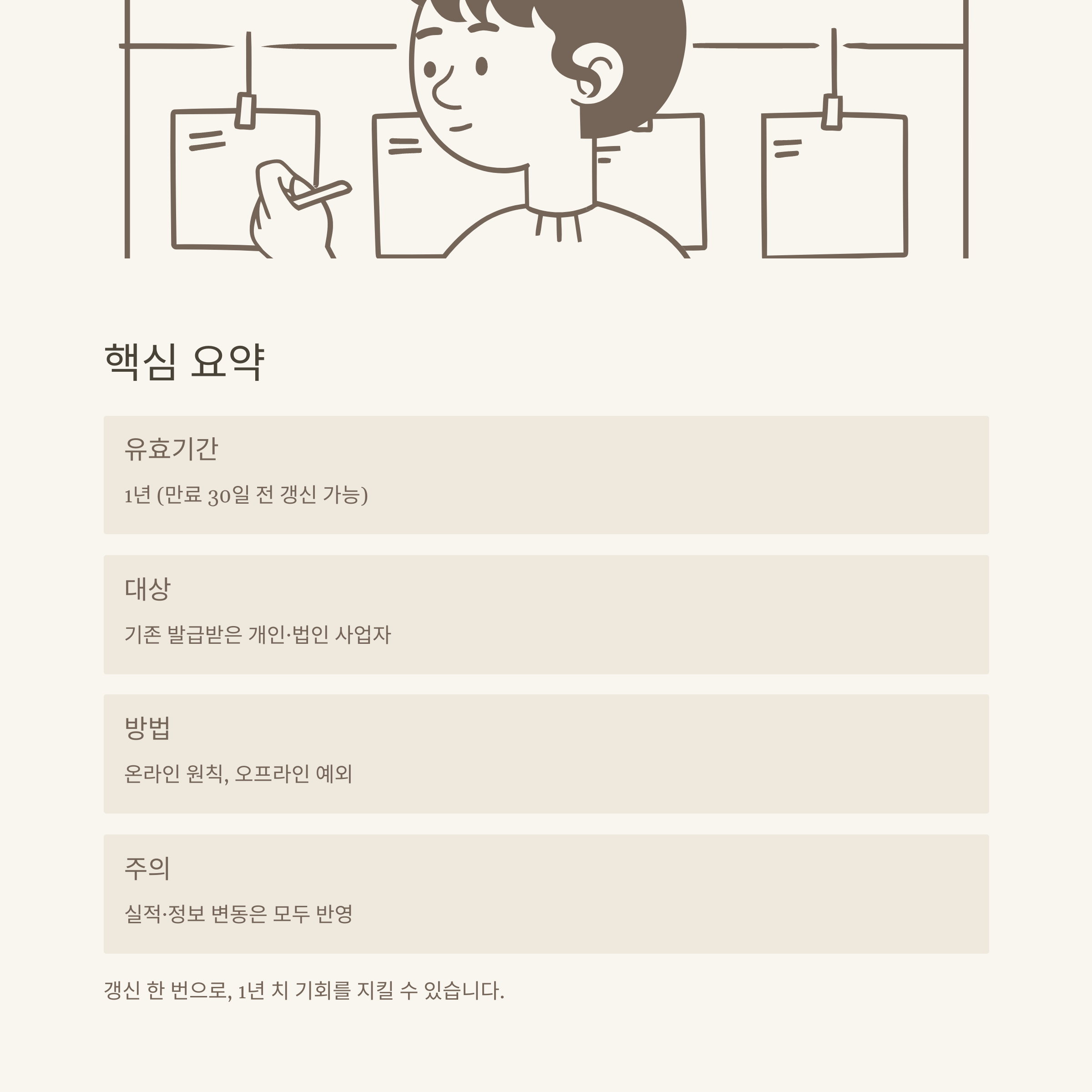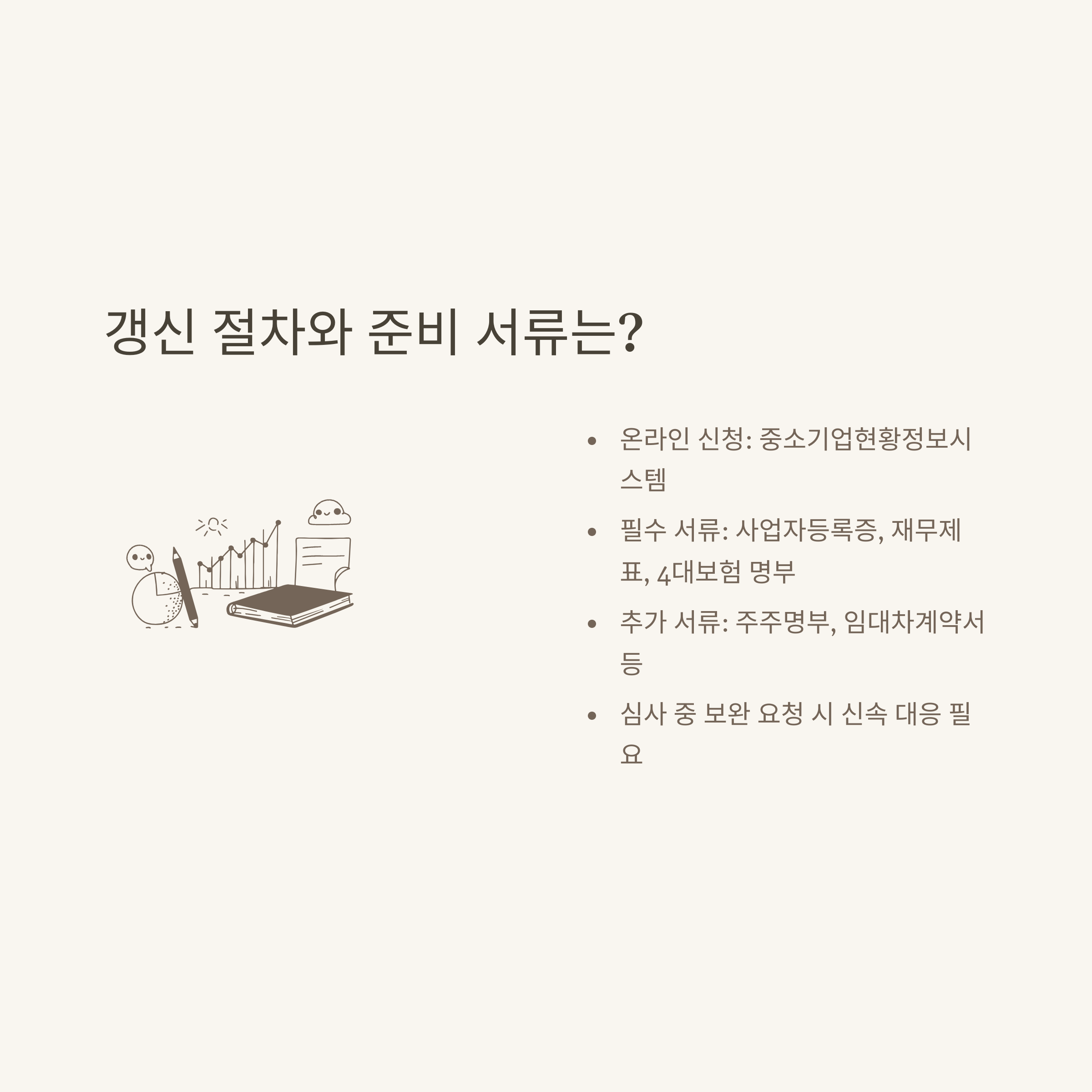 - 온라인 갱신: 중소기업현황정보시스템(sminfo.mss.go.kr) 접속 후 사업자 등록번호 로그인 → 갱신 메뉴에서 절차 진행