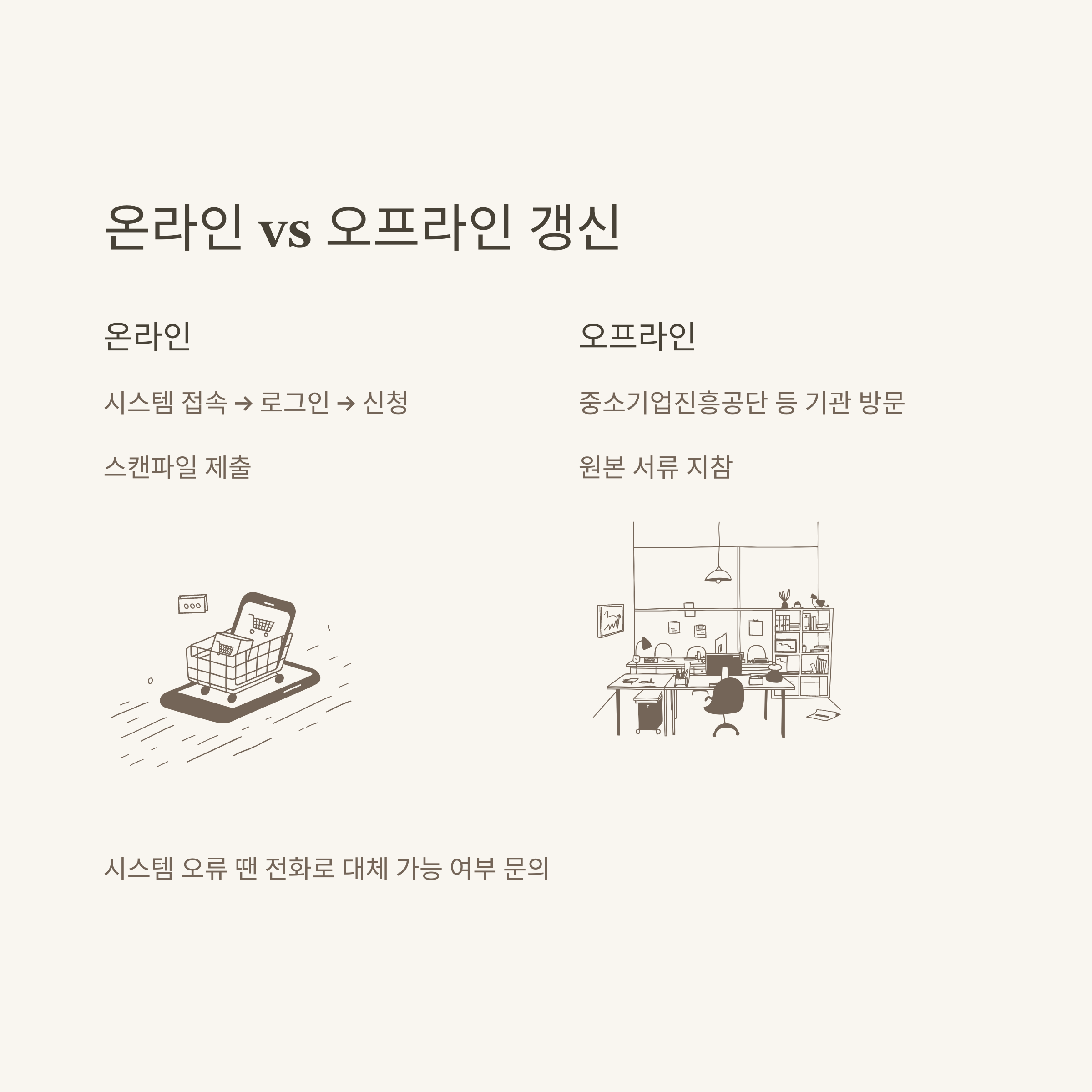 - 오프라인(방문) 갱신: 중소기업진흥공단 등 담당기관에 직접 서류 방문 제출