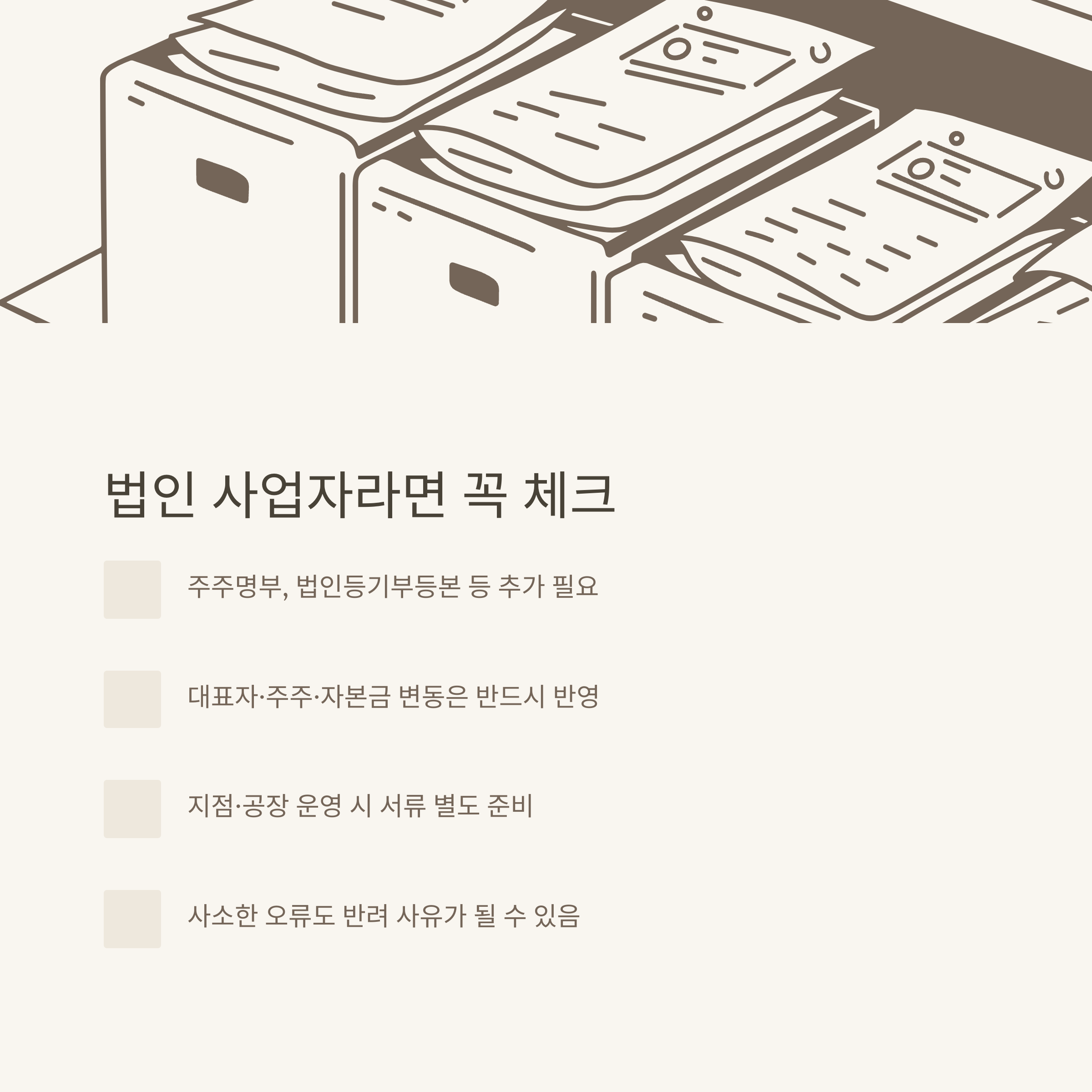 - 필요시 업종별 추가서류(위임장, 임대차계약서, 주주명부 등) 준비