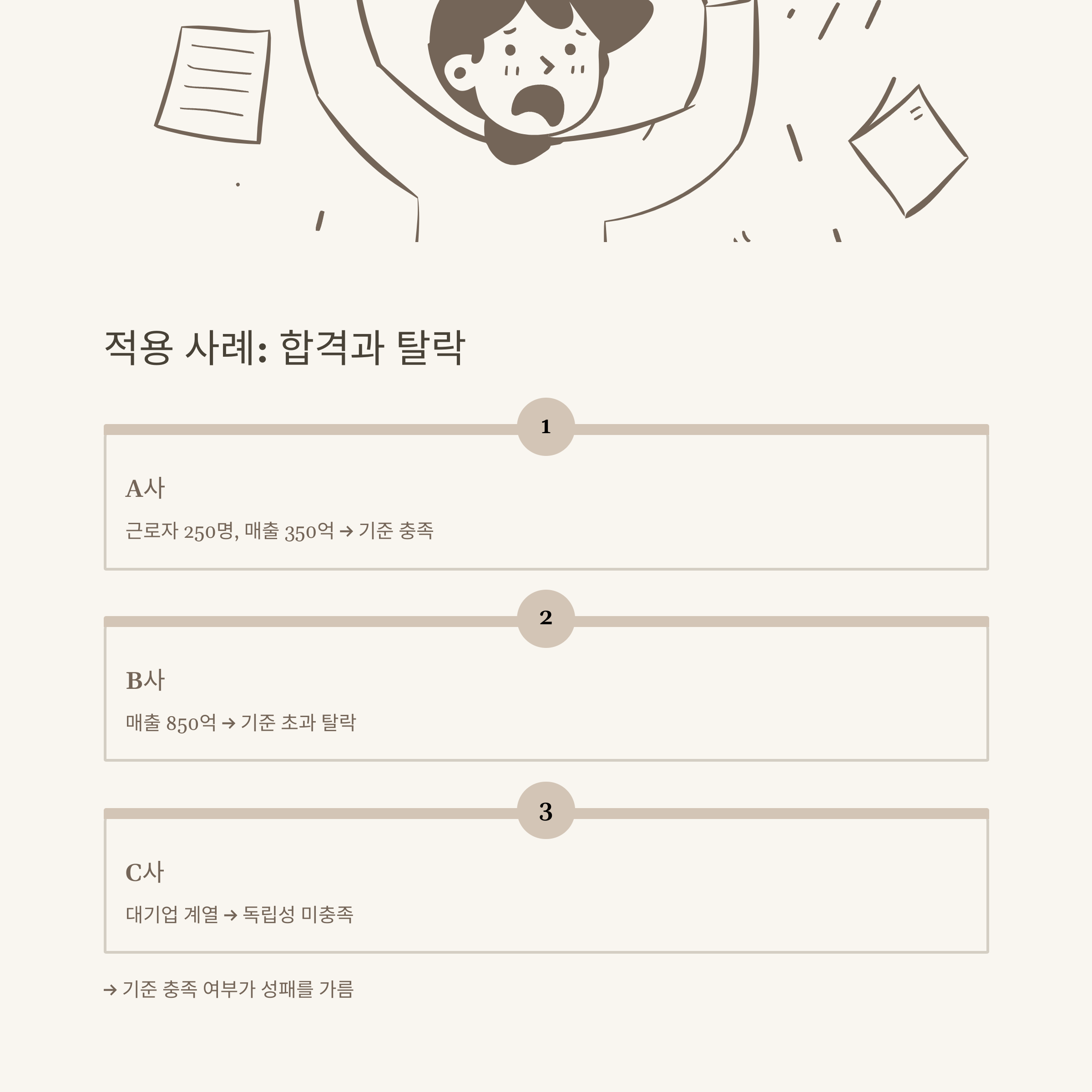 - 제조업 A사는 상시근로자 250명, 자산 4,800억 원, 최근 3년 매출 350억 원으로 기준 충족 → 정부지원사업 선정