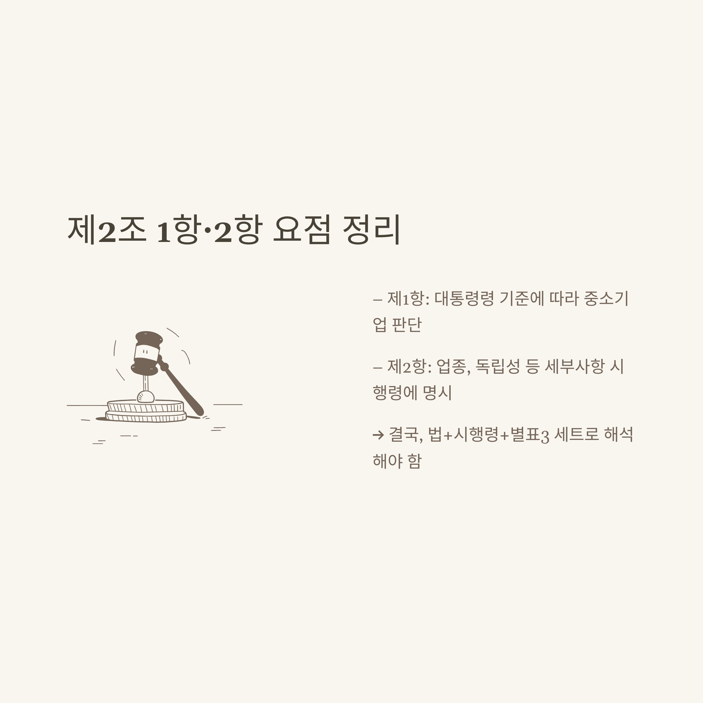 - 제2조 2항: 대통령령(시행령)에서 업종별 기준, 소유·경영 실질적 독립성 등 세부 요건을 추가로 정한다