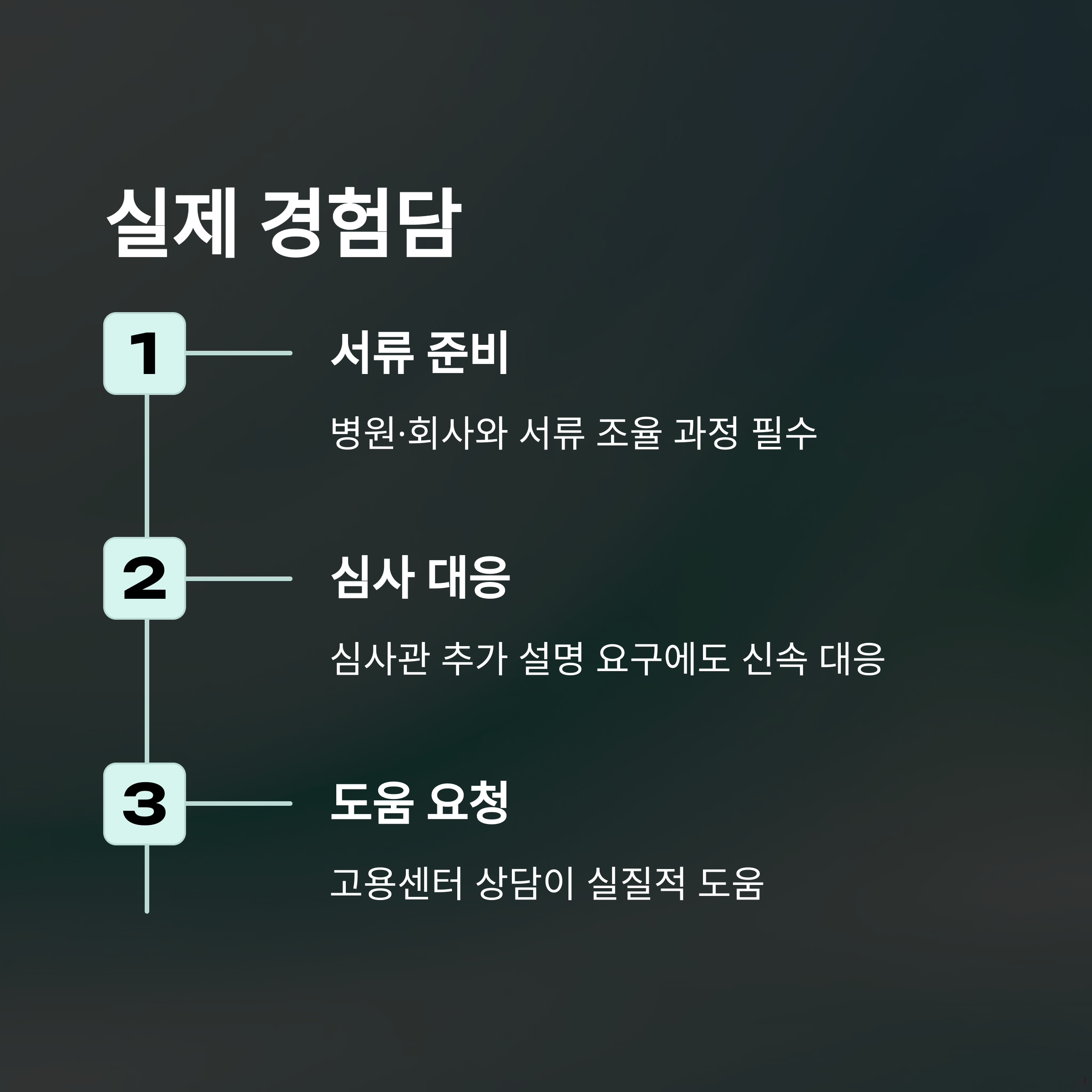 의사소견서는 단순 “병명”만으로는 부족하고, 반드시 ‘근로 지속 불가’ 문구가 명확히 들어가야 실제로 심사가 빠르게 진행됐습니다. 공식 제출서류 양식 확인이 필수입니다.