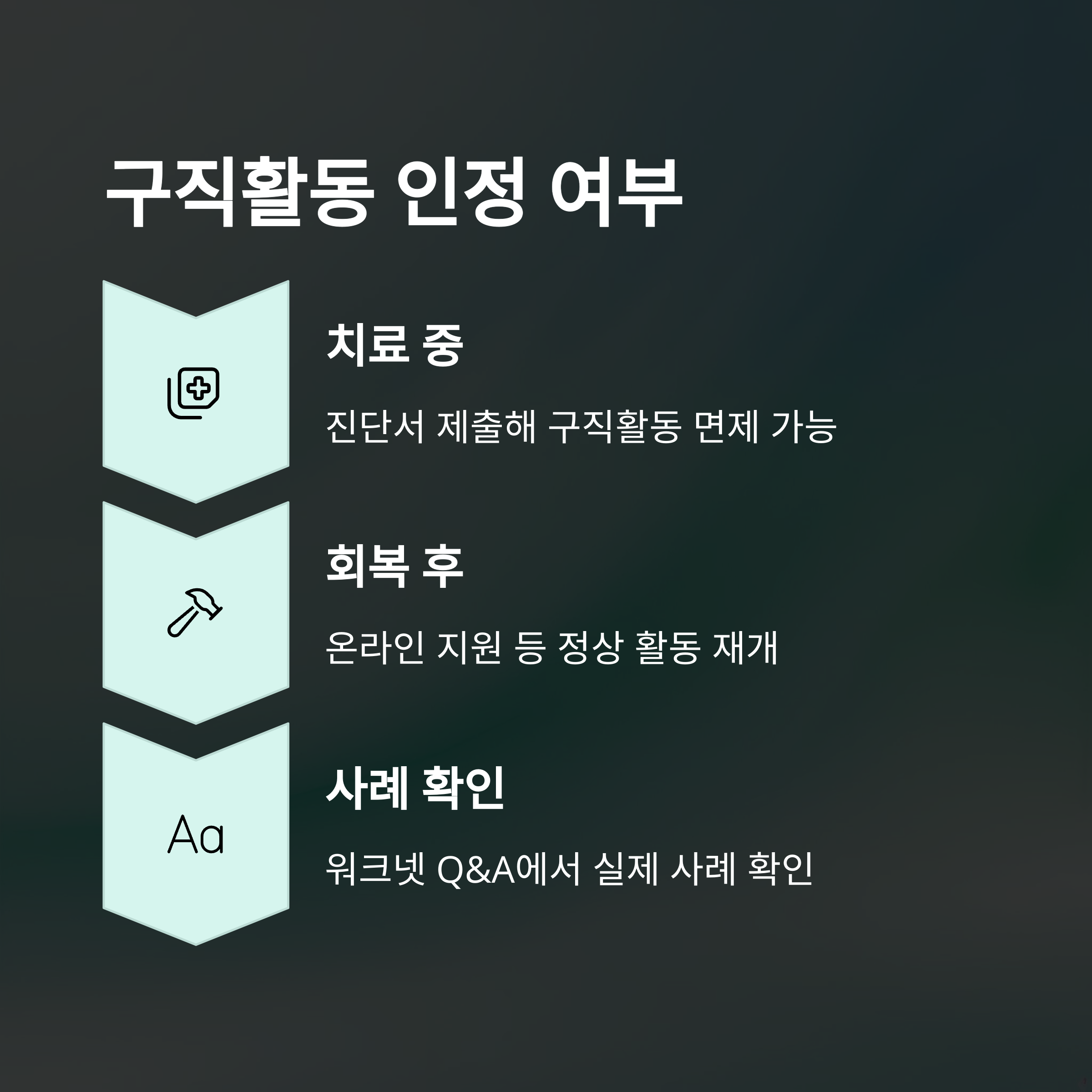 실업급여 수급 중에도 기본적으로 구직활동이 필수입니다. 다만, 질병으로 인해 정상적인 구직활동이 어렵다면, 진단서와 의사소견서를 제출해 구직활동을 면제 또는 연기받을 수 있습니다.