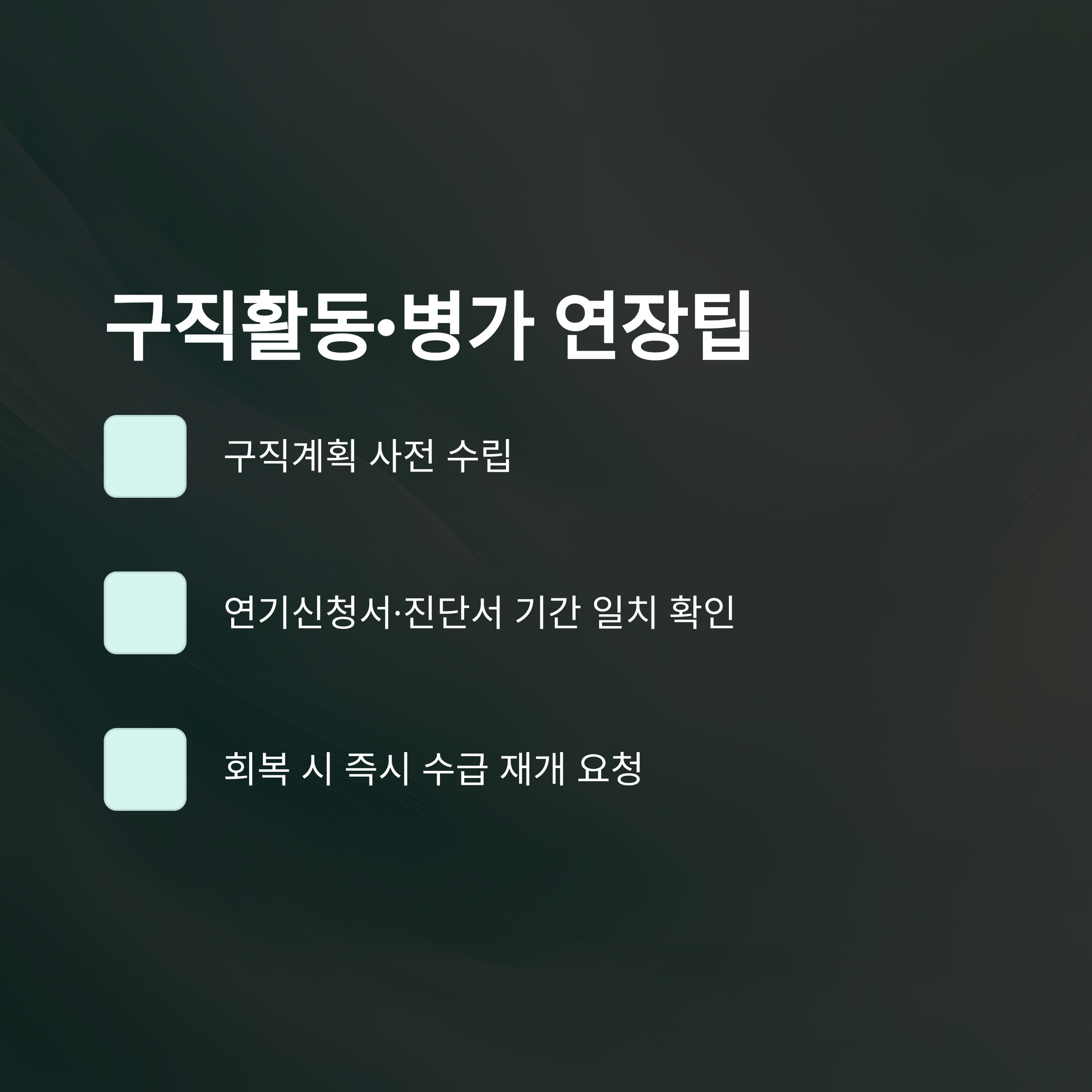 질병퇴사 실업급여의 가장 큰 변수는 구직활동 일정과 병가(연기) 절차입니다. 저 역시 이 과정에서 헷갈릴 뻔한 적이 많았는데, 다음 팁을 꼭 기억해두면 실수 없이 진행할 수 있습니다.