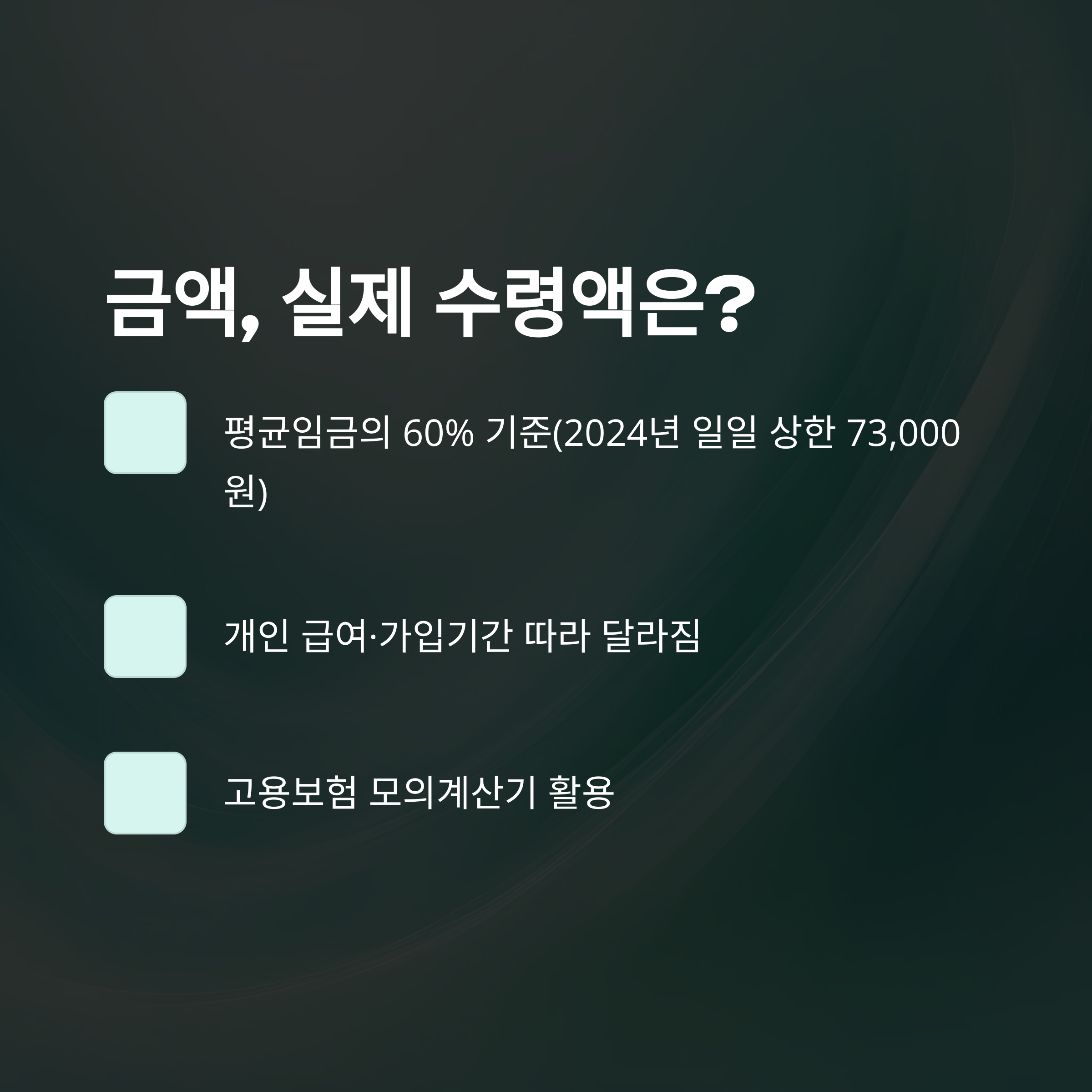 | 실업급여 금액 | 평균임금의 60%, 일일 상한액 73,000원(2024년 기준) |