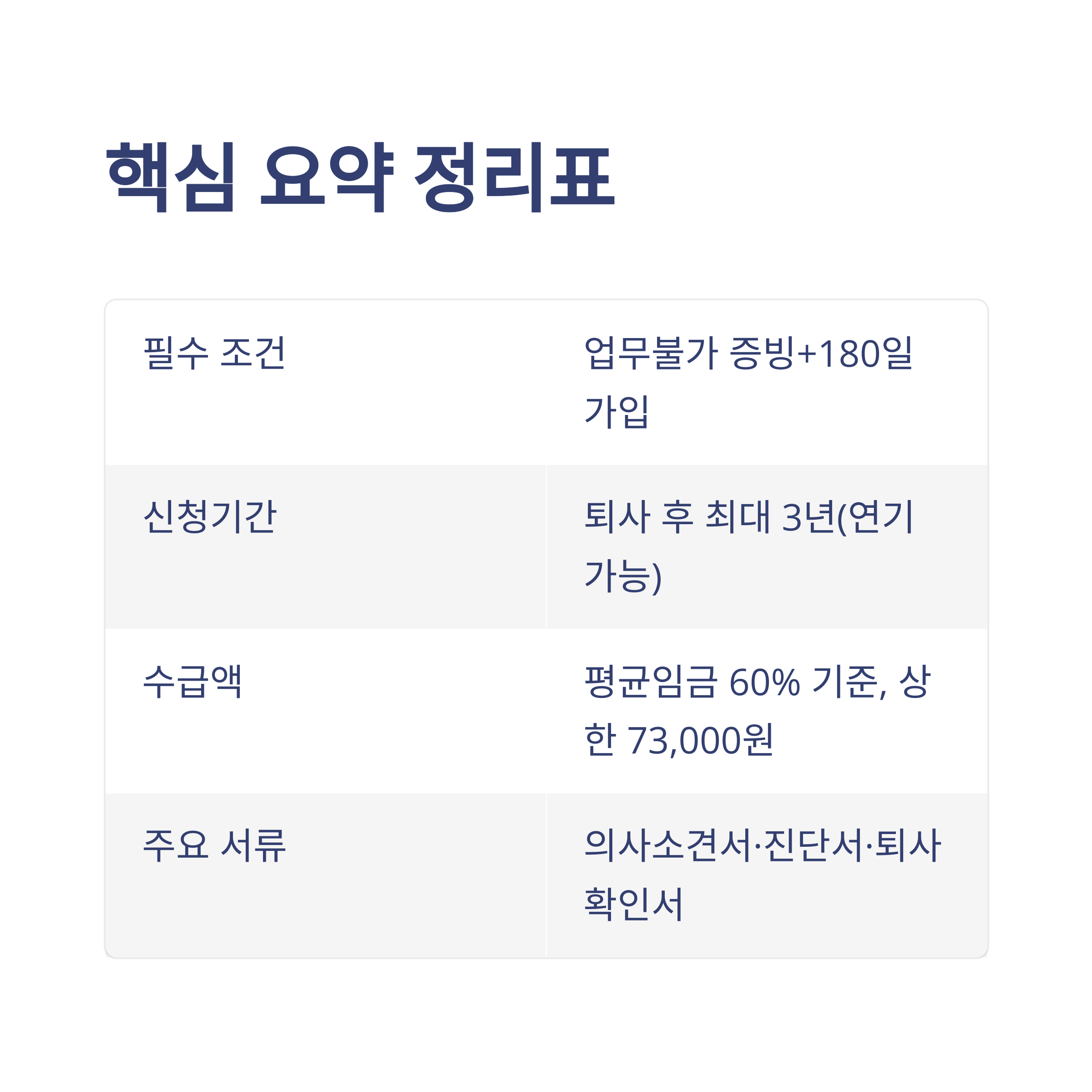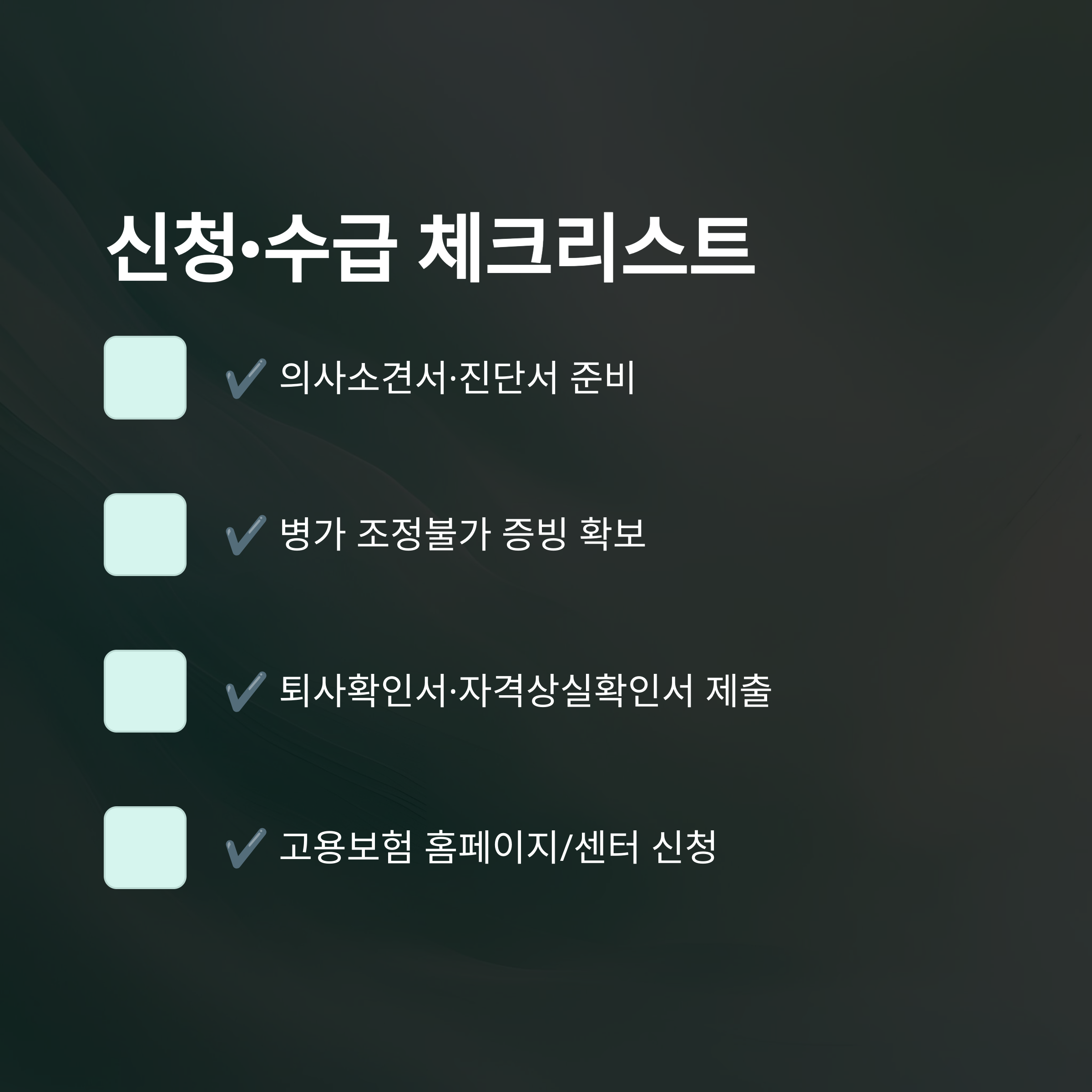 | 주요 서류 | 의사소견서, 진단서, 퇴사확인서, 병가·휴직 조정불가 확인서 등 |