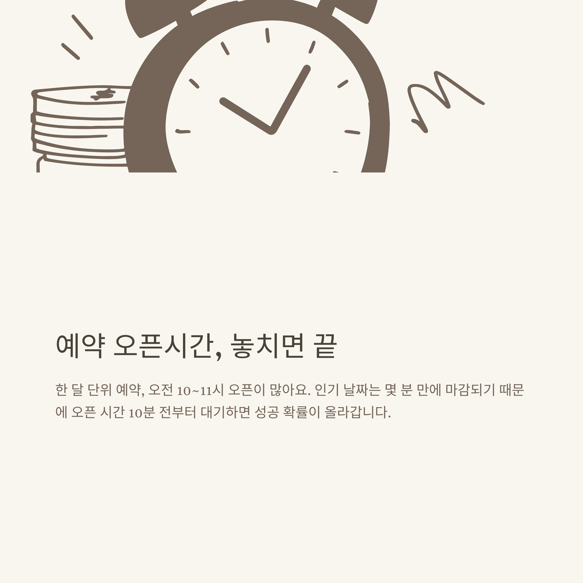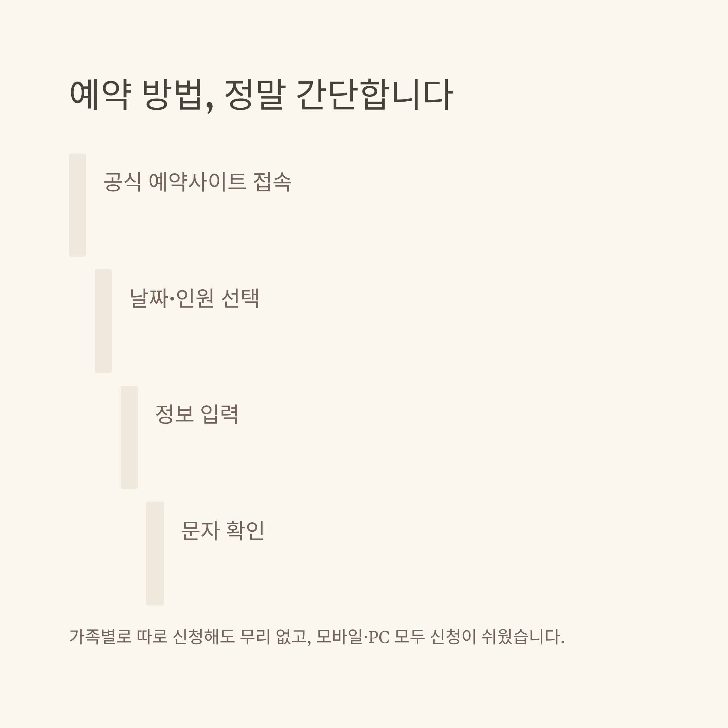 공식 홈페이지 공지사항에서 예약 오픈일·오픈시간 확인(보통 오전 10시~11시 오픈이 많음)