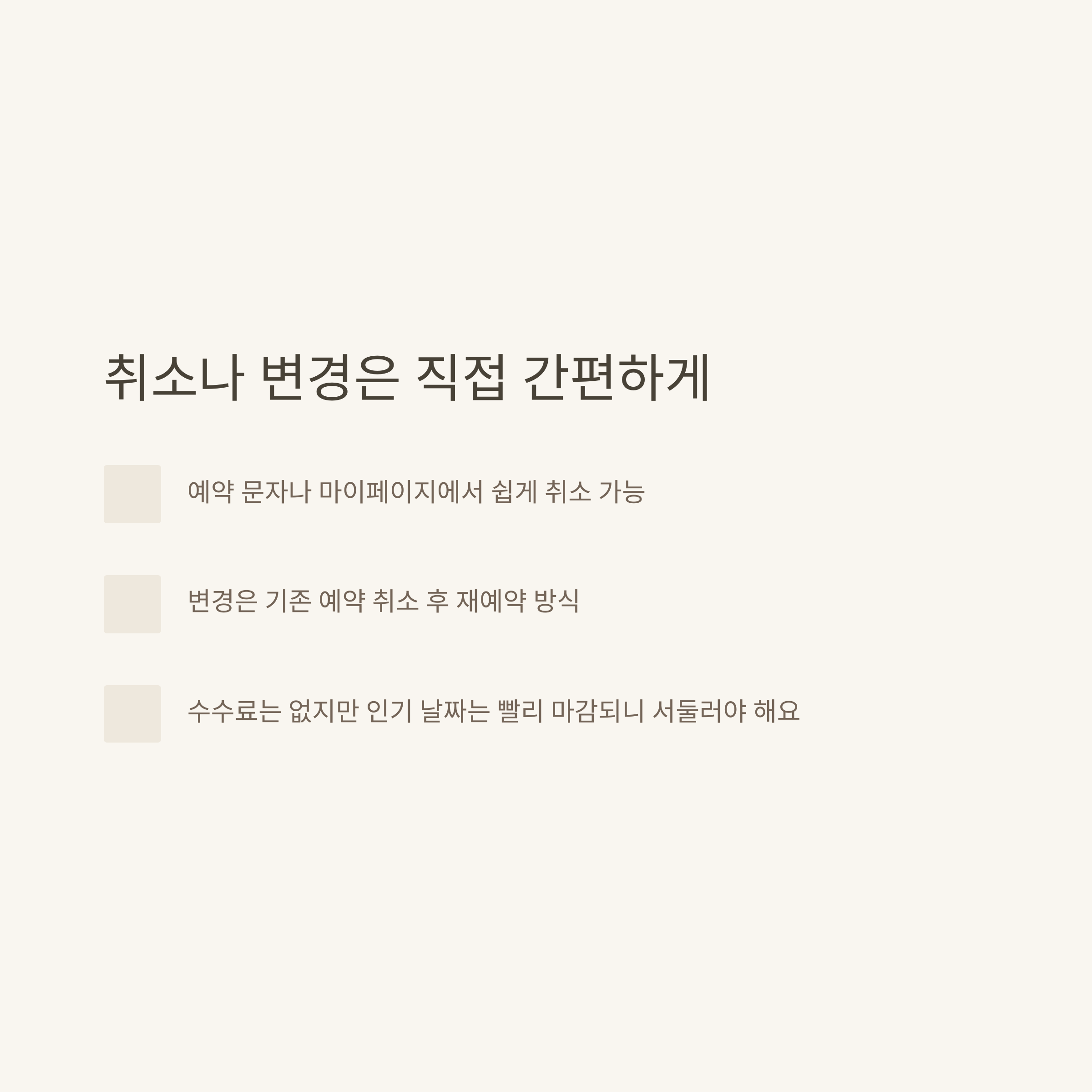 예약 변경은 기존 예약 취소 후, 원하는 날짜로 재예약(변경 기능 별도 없음)