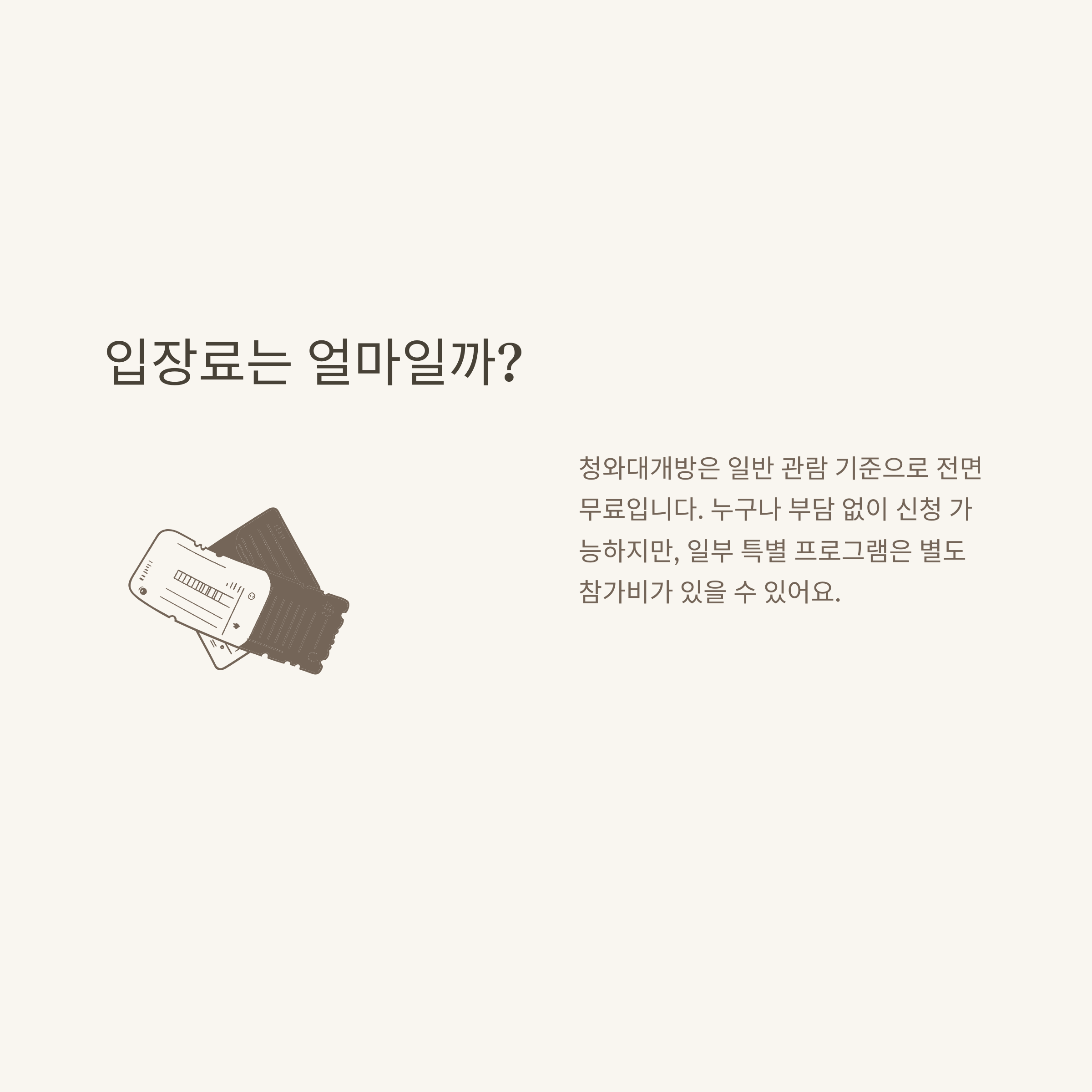 처음 청와대개방 예약을 시도할 때 ‘입장료가 있을까?’ 궁금했던 분들이 많으실 거예요. 저도 현장 가기 전에 가격 정보를 꼼꼼하게 확인했었는데요. 현재 청와대개방 관람은 전면 무료입니다. 별도의 입장료나 관람료가 전혀 없고, 누구나 무료로 관람할 수 있습니다. 유료 관람이 아니기 때문에 가족, 친구, 단체 모두 부담 없이 신청하실 수 있었습니다. 다만, 일부 특별 프로그램(전시, 문화행사 등)은 사전 안내에 따라 별도 참가비가 있을 수 있으니, 꼭 공식 홈페이지 공지사항을 참고하셔야 해요. 아래는 청와대개방 가격 요약 표입니다.