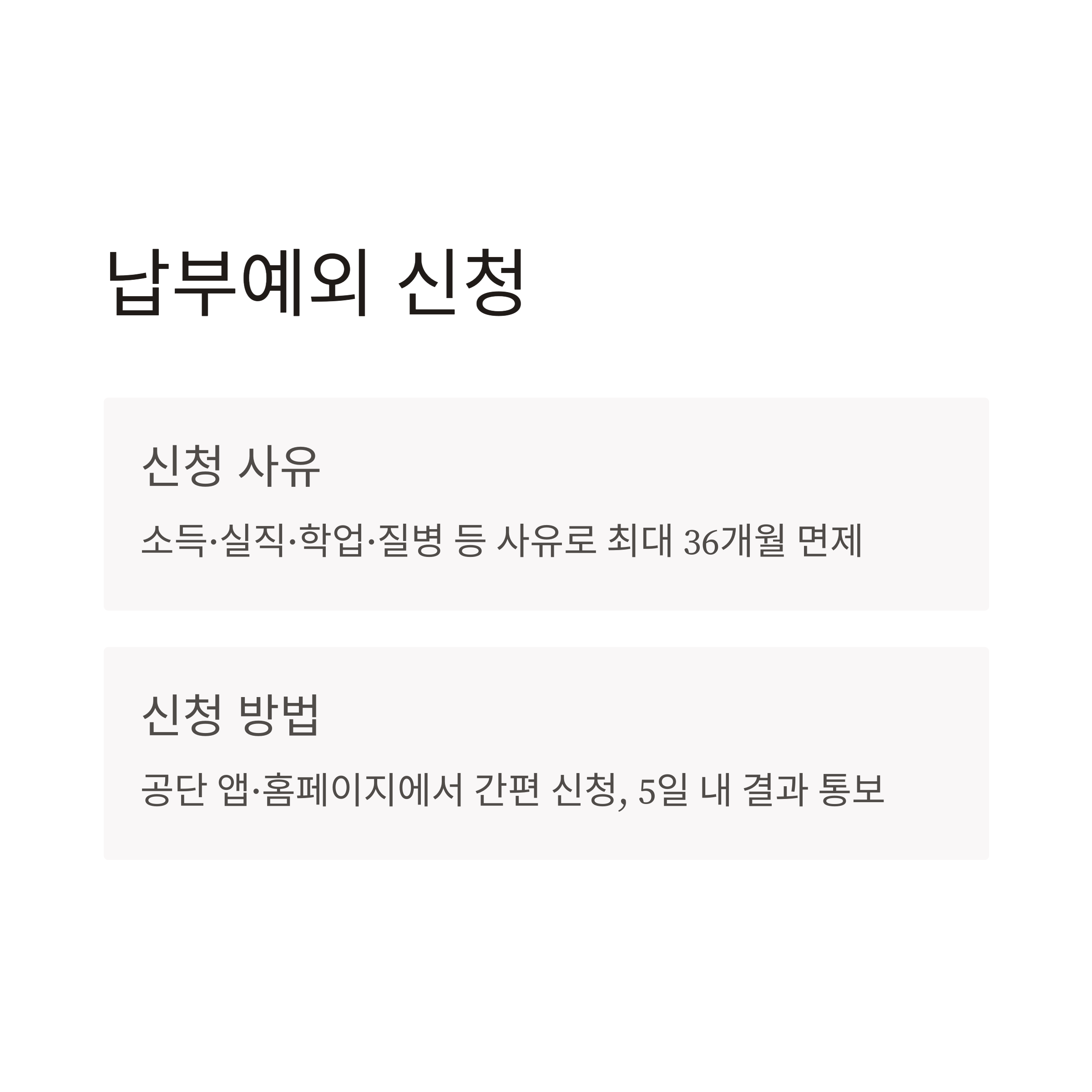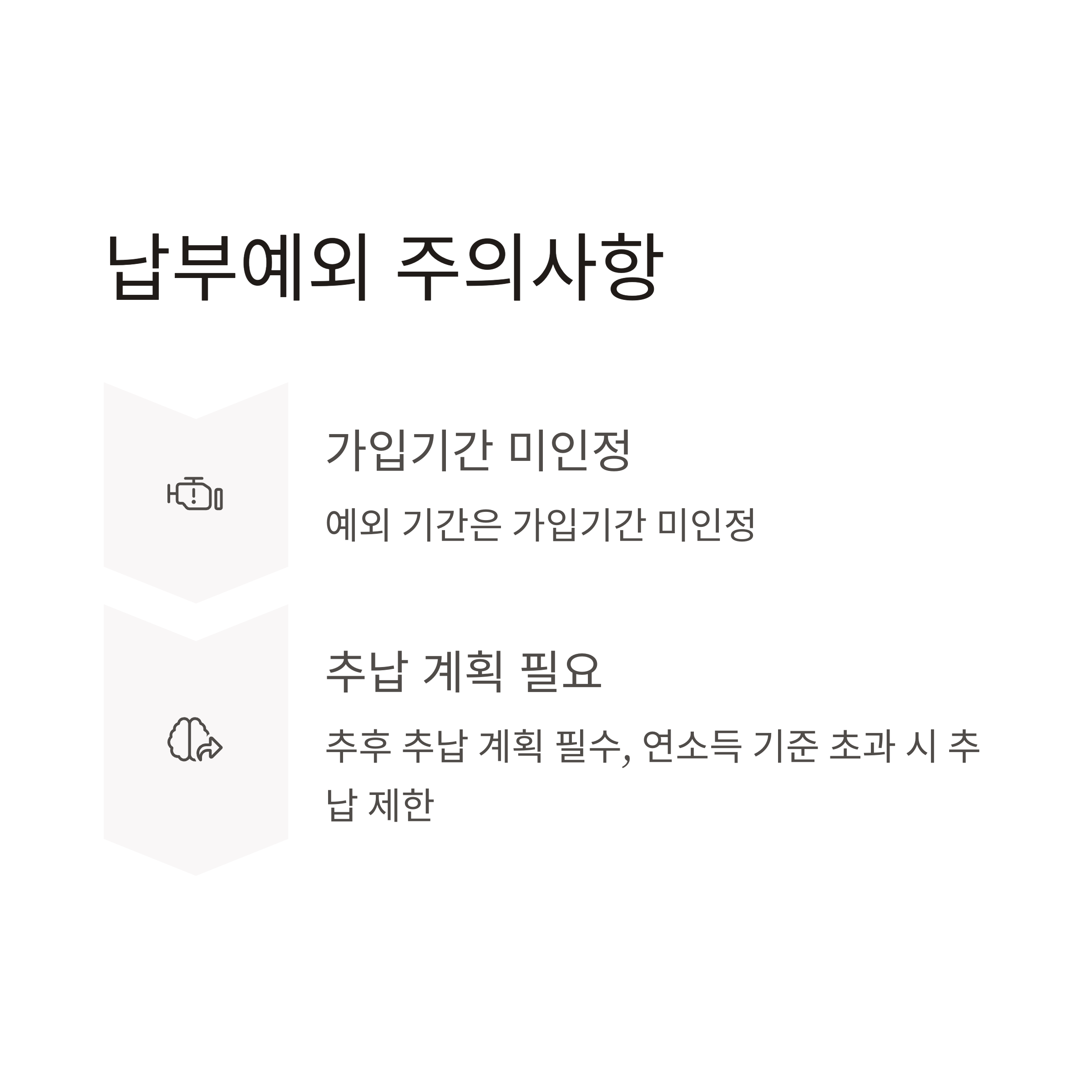| 납부예외 | 무소득 시 신청, 단 가입기간 제외 |