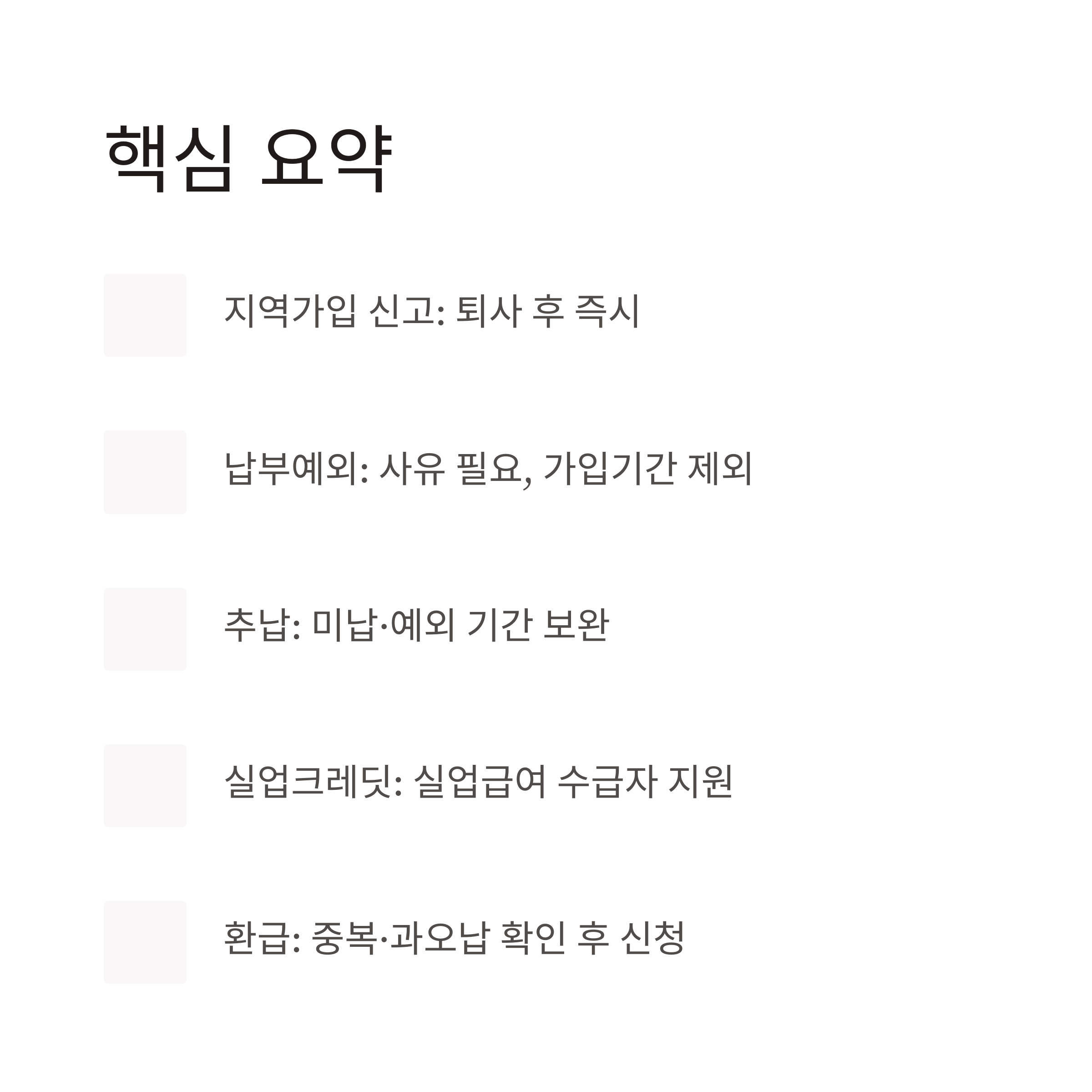 | 지역가입 신고 | 퇴사 후 다음달 15일까지 신고 필수 |