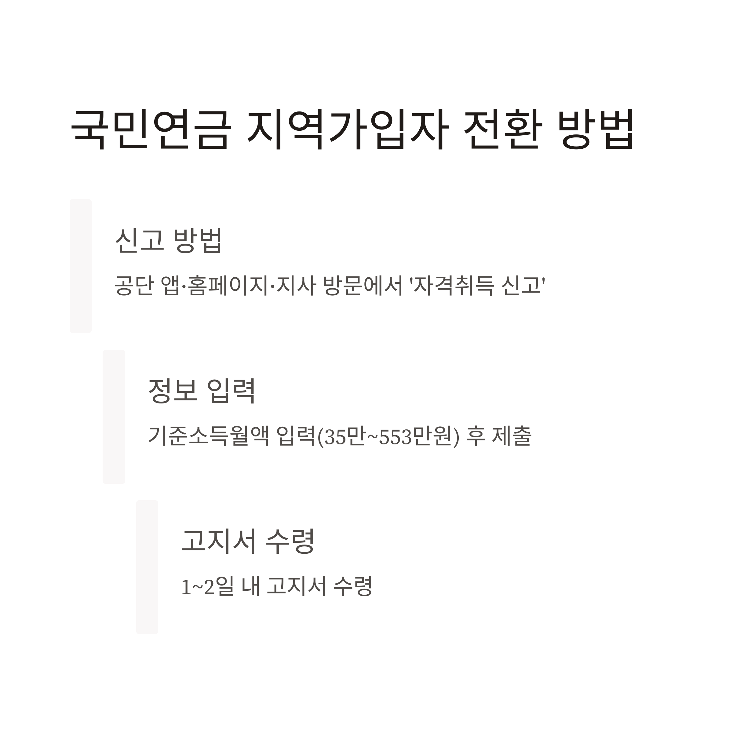 국민연금공단에서는 퇴사한 달의 다음 달 15일까지 지역가입자 자격 신고를 하라고 안내하고 있어요. 저도 공단 앱을 통해 간단히 신청했습니다. 지역가입으로 전환되면 기준소득월액을 기준으로 보험료가 고지됩니다. 기준소득을 너무 낮게 설정하면 향후 연금 수령액도 줄어들 수 있으니 신중해야 합니다.